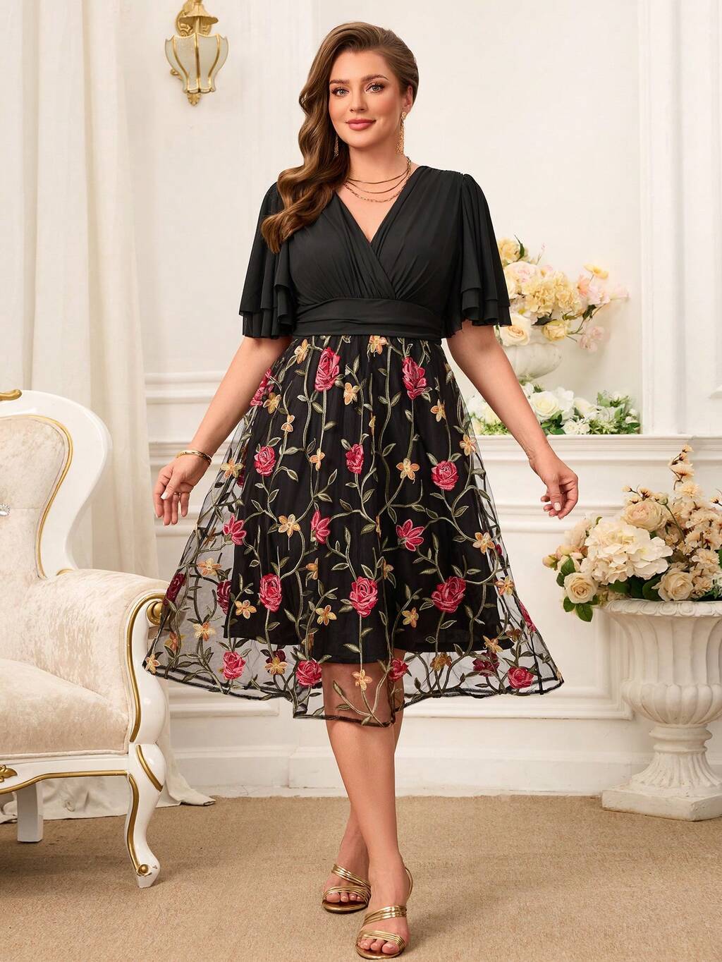 Plus Size Floral Embroidery Patchwork V-Neck Short Sleeve Dress For Summer/ Vacation Plus Size Tea Party Dress Elegant Plus Size Dress Plus Size Cocktail Dress Plus Size Floral Dress Elegant Party Outfit Wedding Guest Dress Floral Embroidered Dress