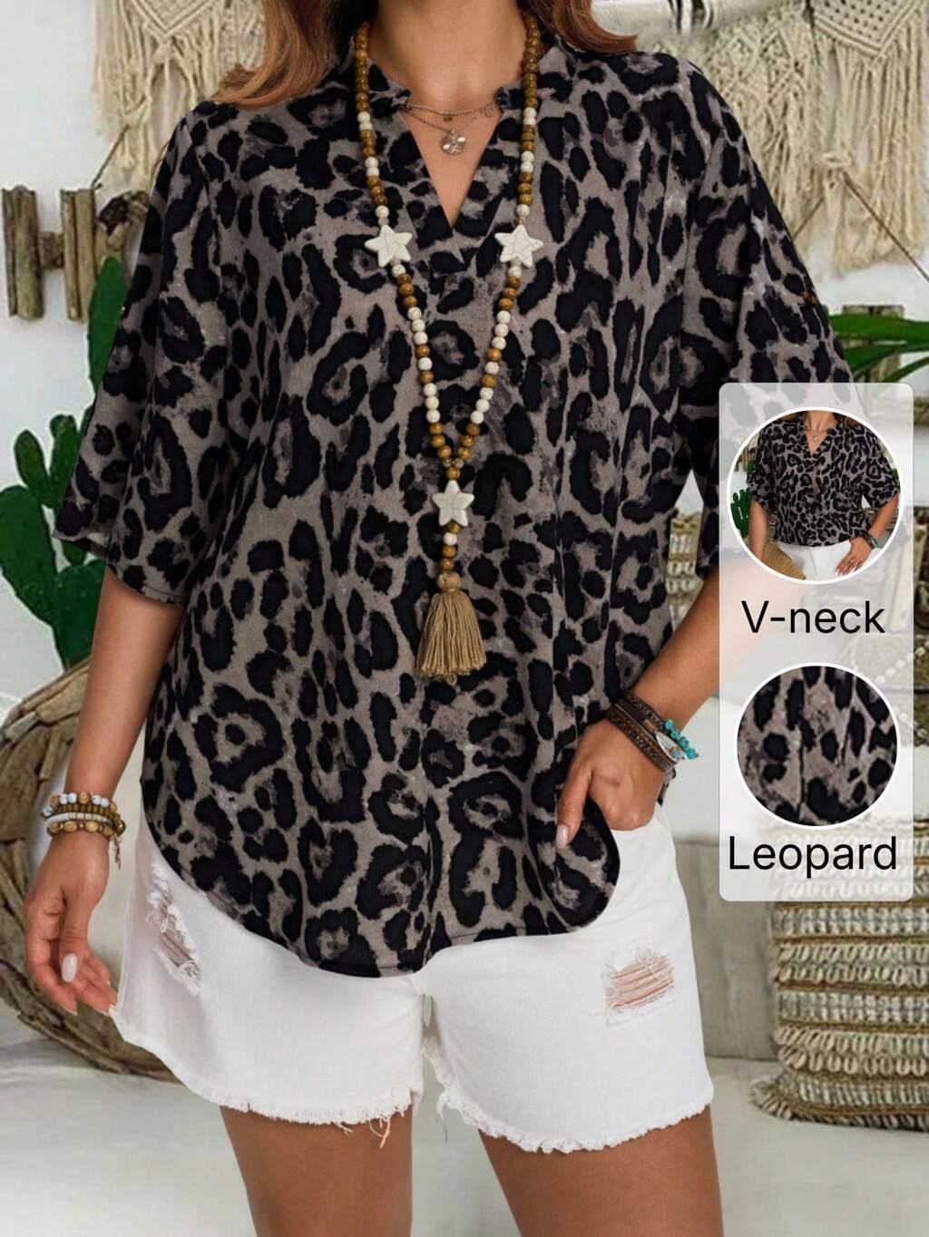 Plus Size Leisure Leopard Printed Cut-Out Collar Shirt,Going Out Tops Women,Plus Size Women Clothes,Suitable For Early Autumn