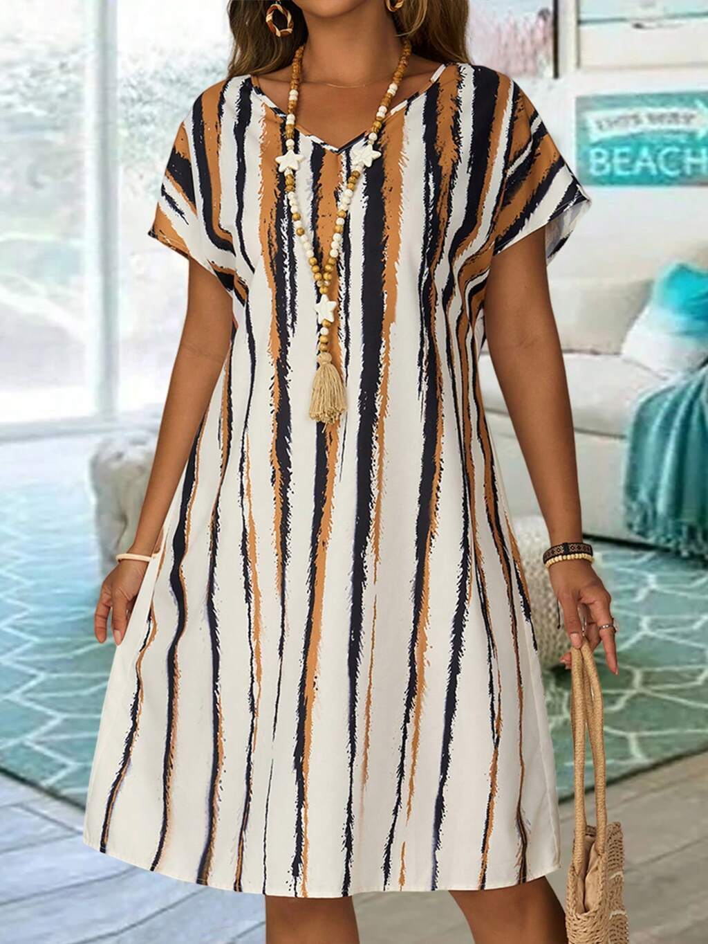 Plus Size V-Neck Batwing Short Sleeve Straight Loose Casual Dress,Summer Clothes,Vacation Outfits Woman / Vacation,Boho Women Clothing,Spring