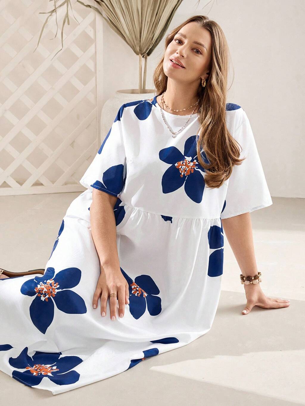Plus Size Summer Casual Polka Dot And Floral Print Dress