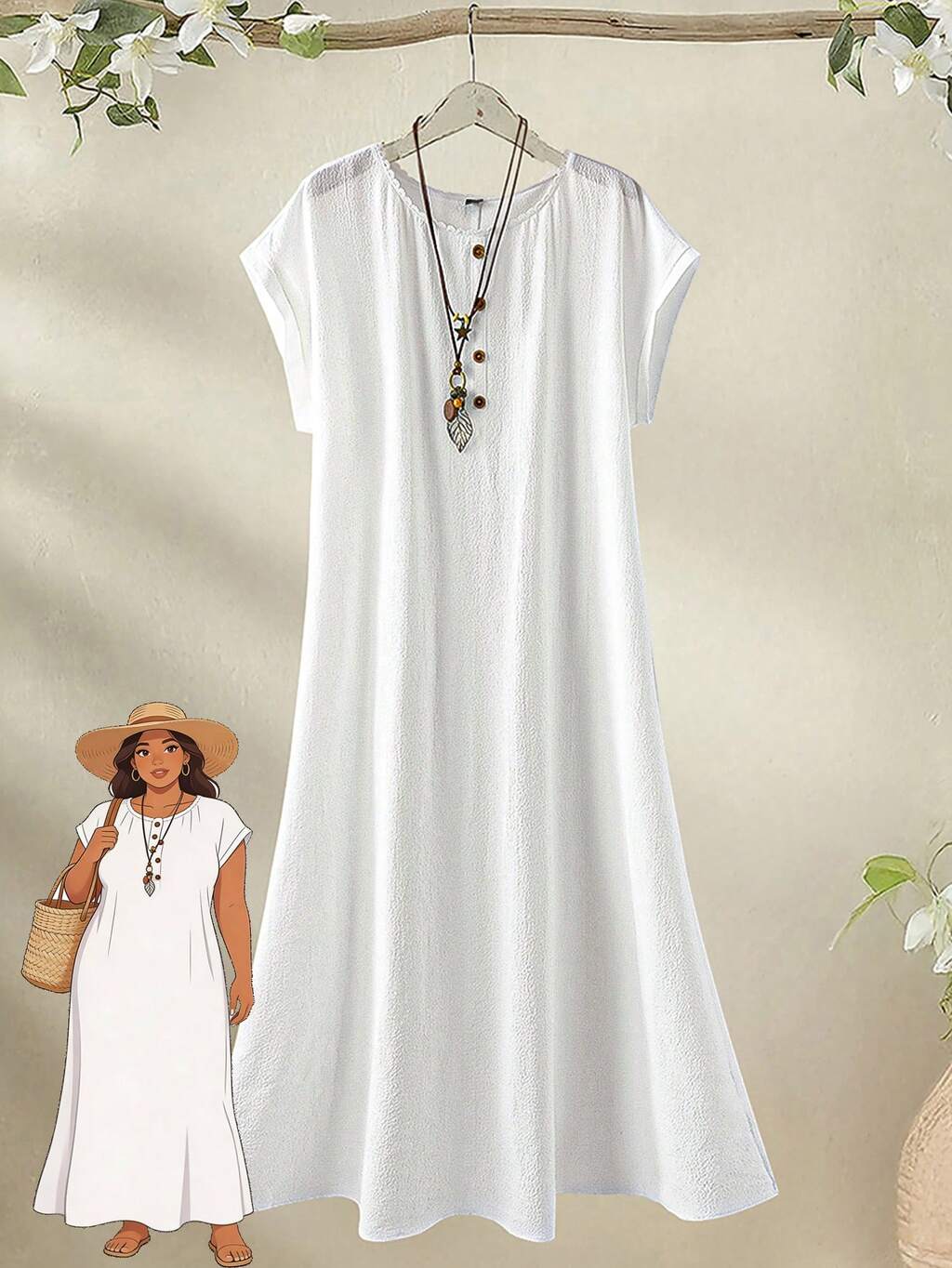 Plus Size Women's Casual Solid Color Round Neck Batwing Sleeve Dress, Summer,Spring Clothes Women,Beach Vacation Outfits For Women ,Vacation Outfits Women, Casual Dresses For Women,White Dress For Women,Spring Dresses White Casual Dresses For Women Women's White Dress Short Sleeve White Dress White Vintage Dress Linen Dresses For Women Summer Women Casual Dresses Womens Summer Dresses Zanzea Dress For Women