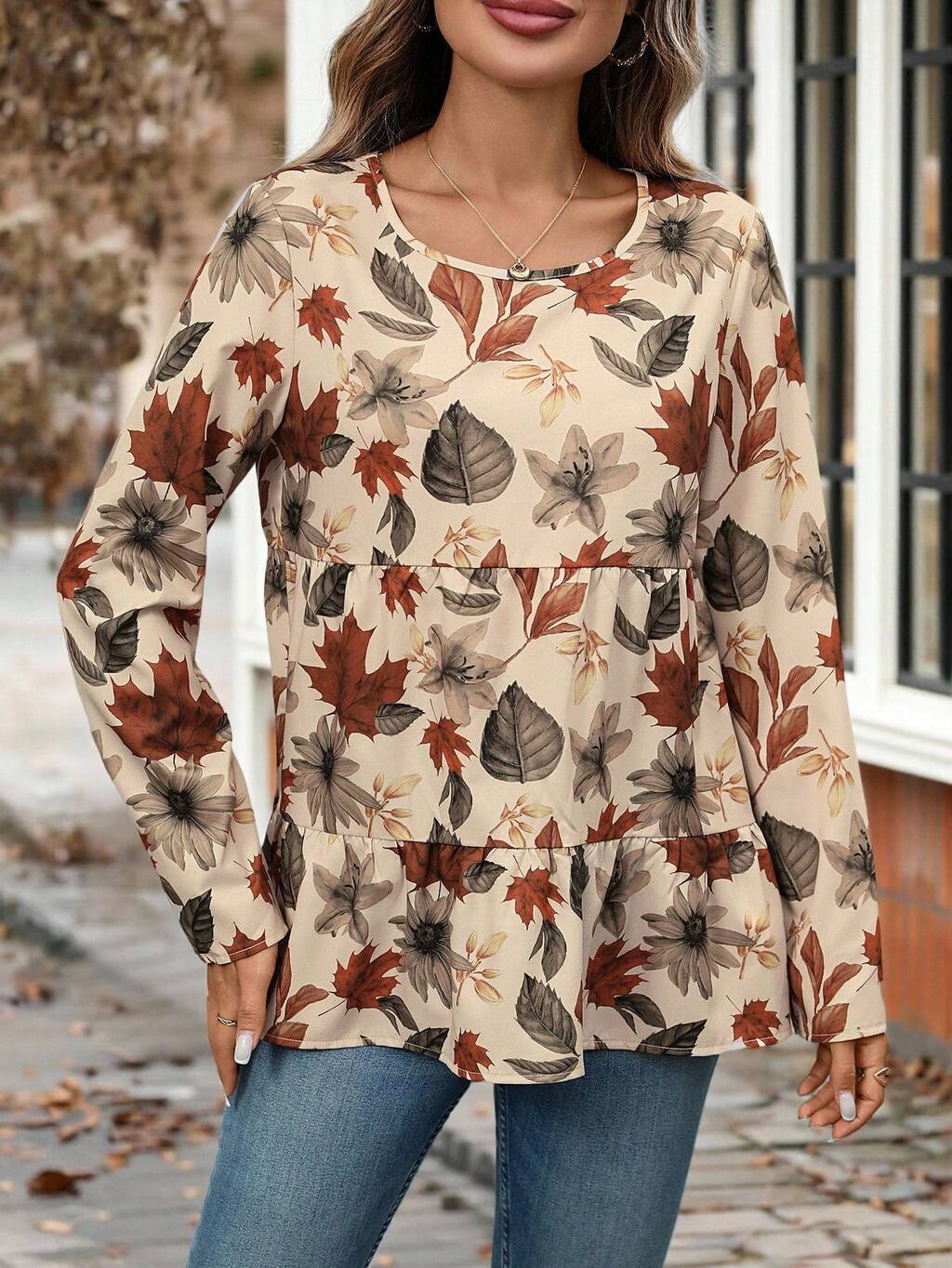 Women's Round Neck Raglan Sleeve Fashion All-Over Print Loose Pleated Ruffle Hem Blouse Casual Blouses For Women Fall Women Long Sleeve Blouse Fall Tops Women Women's Casual Tops Flower Tops For Women Modest Tops For Women Fall Shirts Going Out Tops For Women