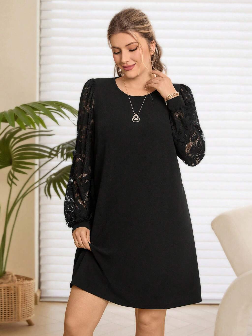 Plus Size Women Contrast Lace Round Neck Long Sleeve Loose Elegant Dress, Plus Size Red Elegant Dress, Elegant Dresses For Party, Autumn/Winter, Going Out Outfits,2025 New Clothes, Simple And Fashionable For Everyday Wear, Plus Size Winter Clothes, New Year Dress, Comfortable And Breathable, Flowy Dress, Christmas Outfit For Women, New Year Clothes, Modest Dress For Women, Suitable For Multiple Occasions, Christmas, Date Night Outfits Women, Night Party, Elegant Party, Date Night Outfits Women, Thanksgiving Outfit For Women