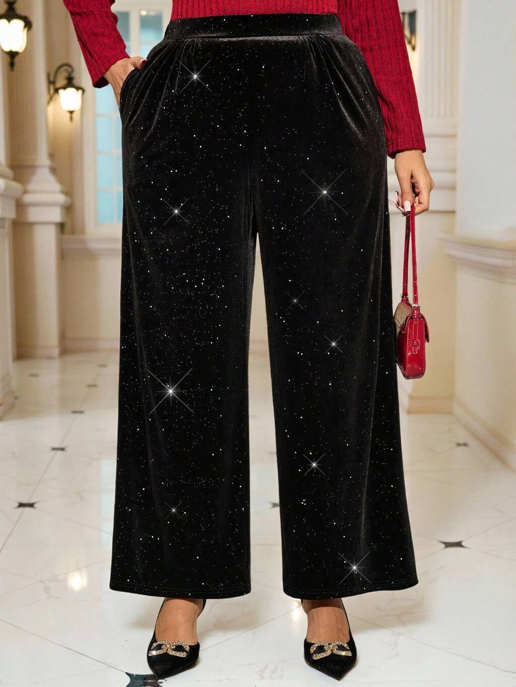 Plus Size Women High Waist Pockets Shiny Wide Leg Loose Elegant Pants, Black Pants, Shiny Pants, Litter Pants, Sequin Pants Women, Velvet Pants Women, Autumn/Winter, 2025 New, Clothes For New Year Christmas Clothes Elegant Dress Women Winter Clothes For Women Cozy Fall And Winter Clothes For Women Christmas Pajamas Christmas Clothes New Year Clothes Winter Clothes For Women