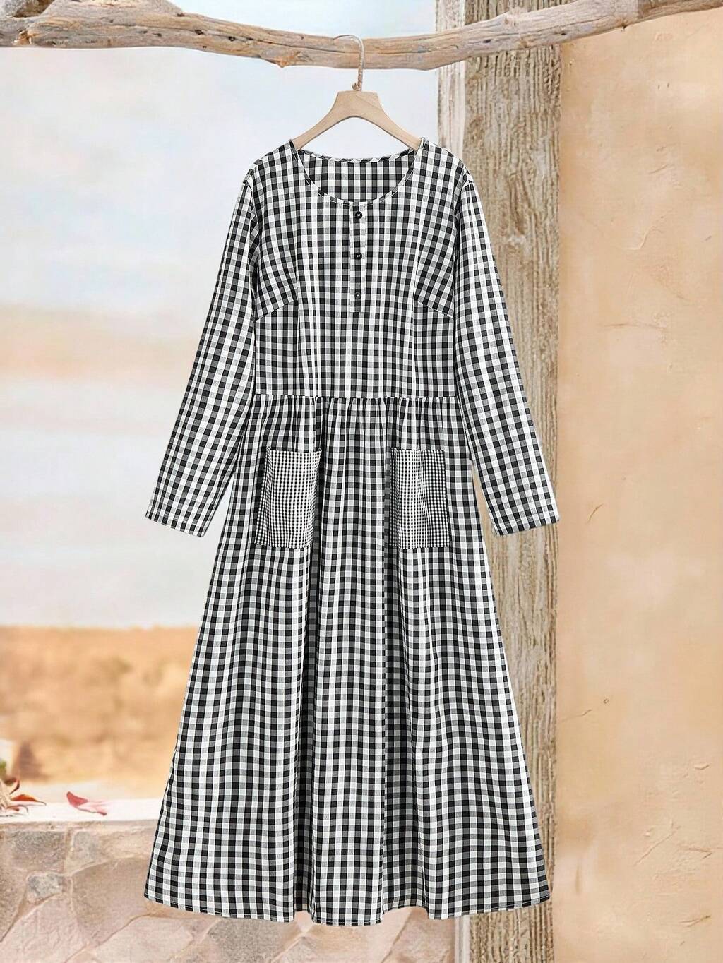 Plus Size Women's Casual Black & Plaid Patchwork Round Neck Long Sleeve Pocket Dress, Autumn/Winter,Going Out Outfits,2025 New Clothes,Simple And Fashionable For Everyday Wear, Plus Size Winter Clothes,Christmas Outfit For Women ,New Year Clothes,Thanksgiving Outfit For Women, Plaid Dress Women, Women Long Dress, Boho Dress Casual Dress With Pockets,Flowy Dress