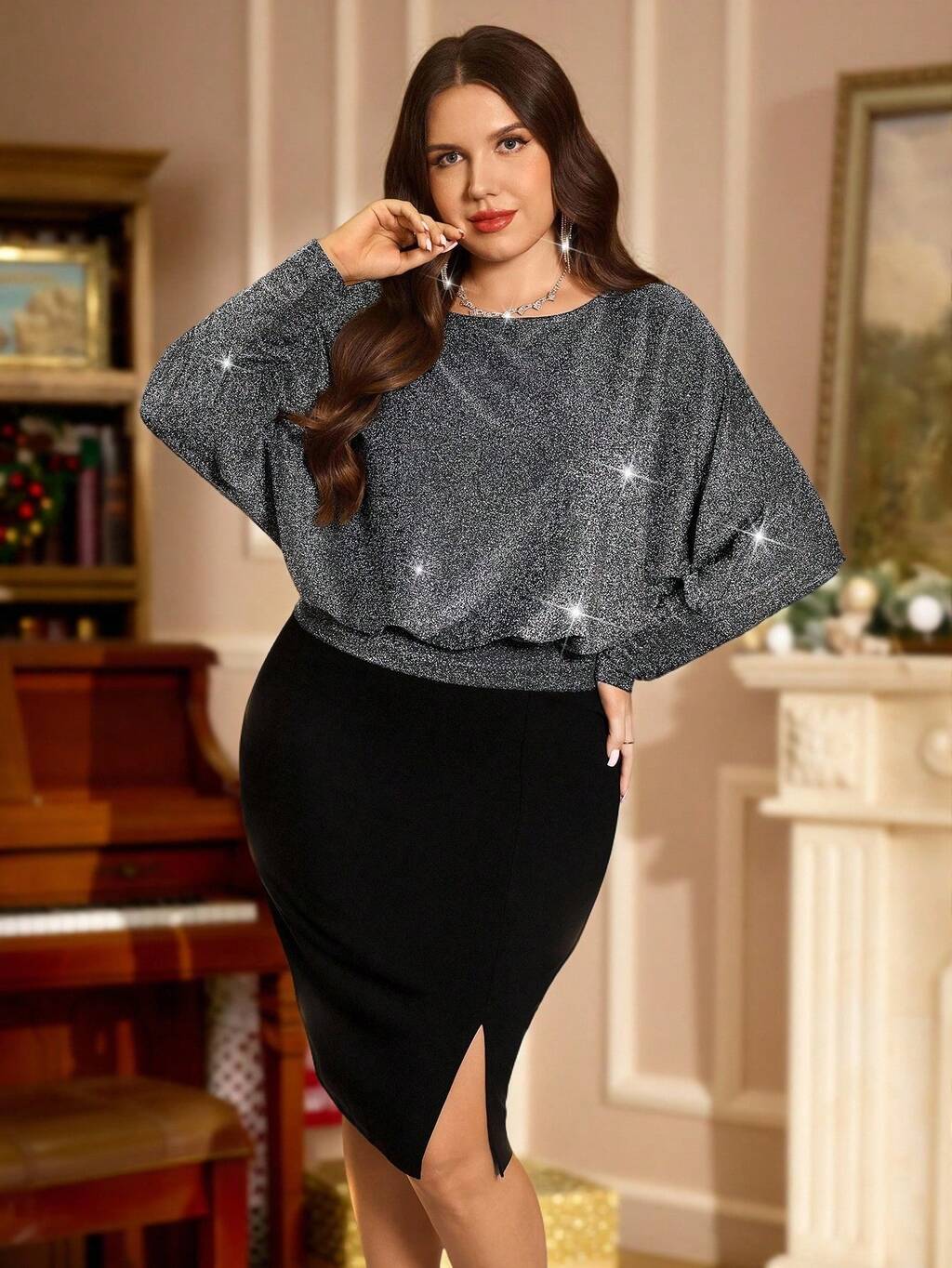 2pcs Plus Size Women Fall/Winter Elegant Party Casual Batwing Sleeve Long Sleeve Sparkle Silver Top T-Shirt And Black Slit Design Bodycon Skirt 2 Pieces Set, Autumn/Winter,New Year Dress,Plus Size Winter Clothes, Christmas Outfit For Women , Elegant Dresses For Party ,Going Out Outfits,2025 New Clothes,Simple And Fashionable For Everyday Wear, Suitable For Multiple Occasions,Christmas,Women's Formal Wear ,Christmas,Christmas,New Year,Thanksgiving,Date Night Outfits Women Set,Skirt Suit