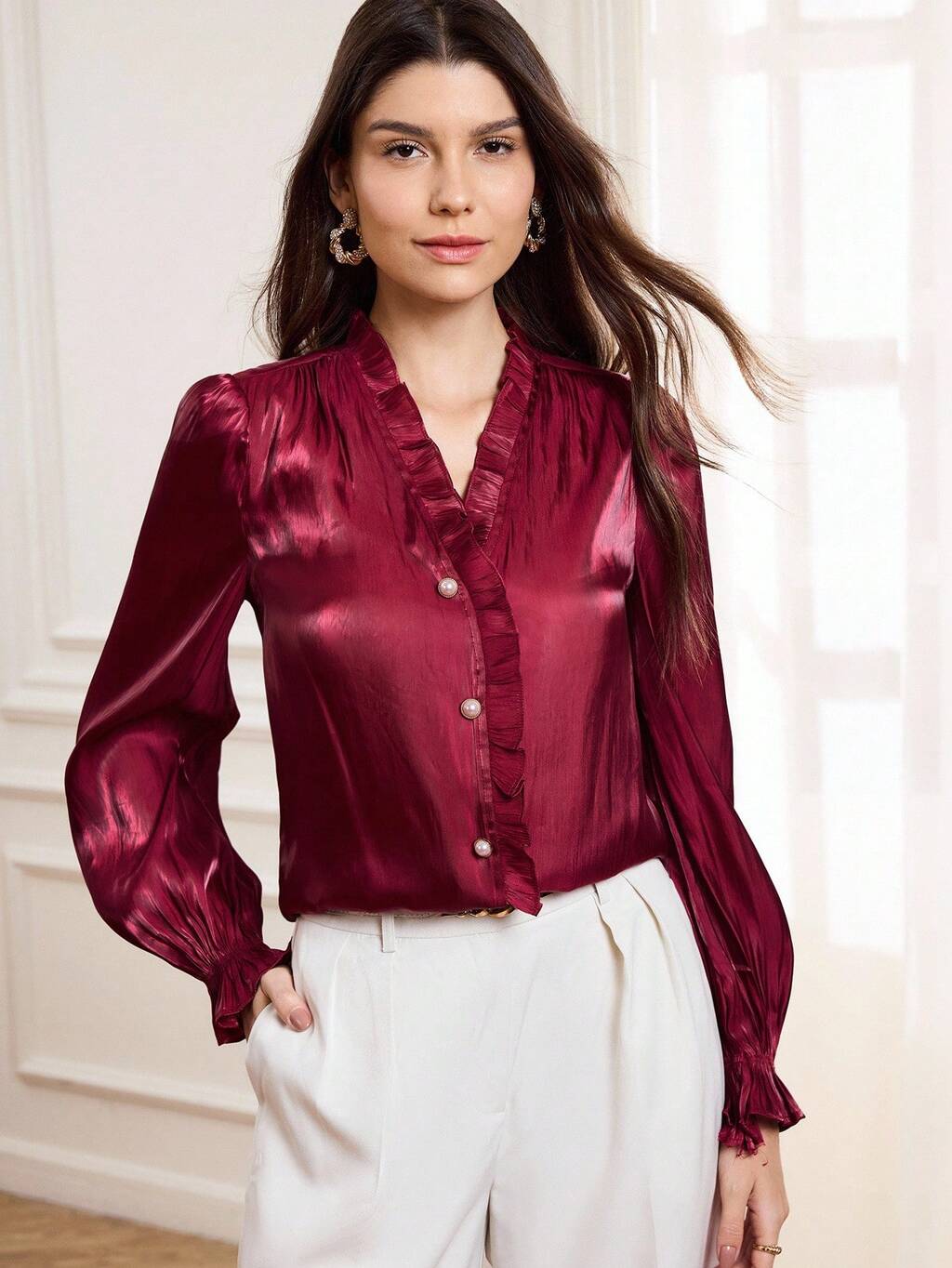 Elegant Burgundy Shirt For Women For Fall And Winter, Featuring A Ruffled Collar And Cuffs. This Elegant Party Shirt Features Delicate Pearl Buttons And A Glossy Burgundy Fabric. This Stylish Shirt Is Perfect For Going Out, An Elegant Party Top, Or A Wedding Guest Shirt.Women's Winter Shirt,Christmas Women's Clothing,Prom Shirt,Chic Women's Shirt, Red Shirt For Women