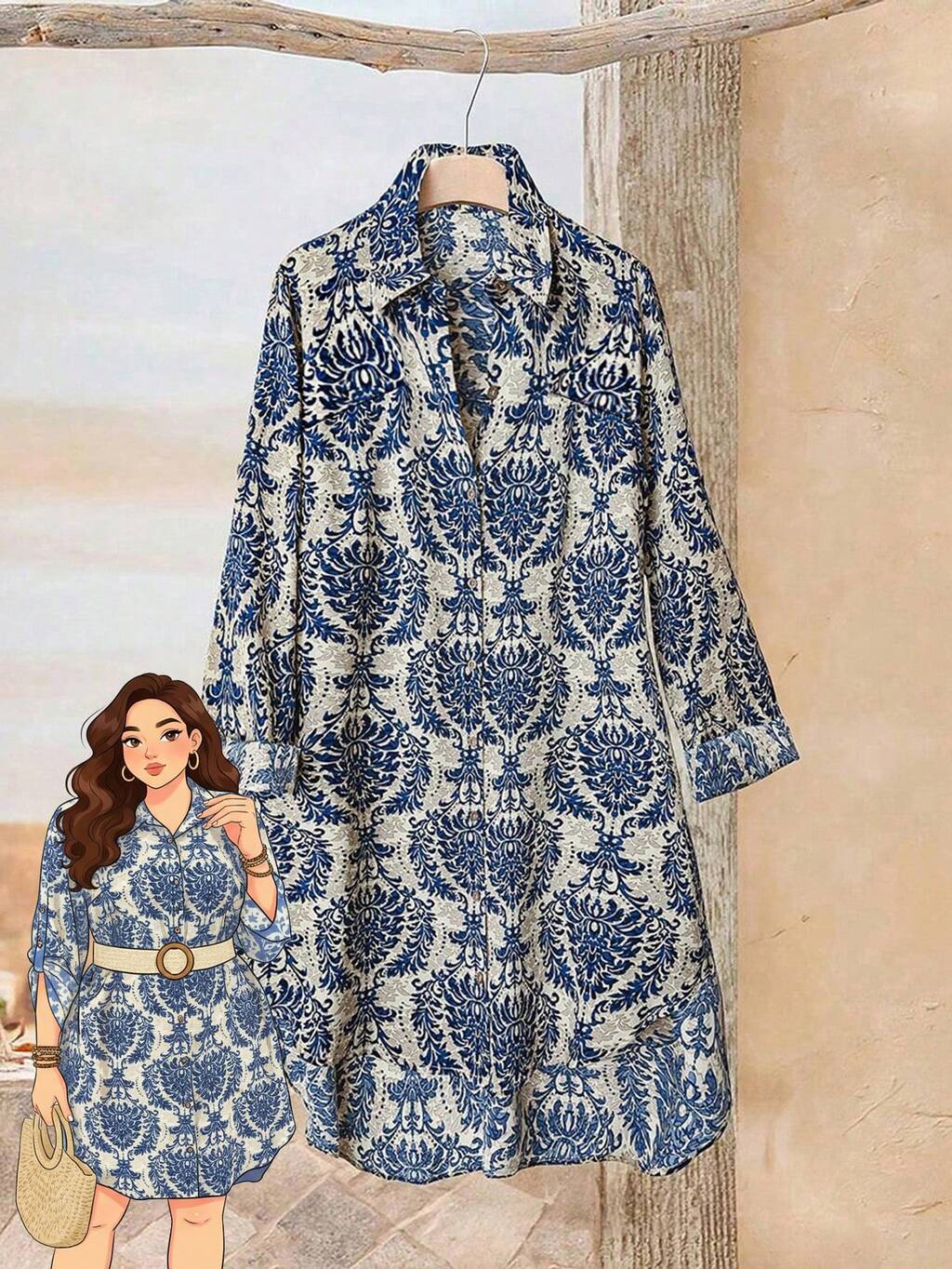 Plus Size Women's Vintage Style Resort Casual Cardigan Shirt Dress With Button, Curved Hem, Short Length, Long Sleeve, Suitable For Early Autumn,Spring