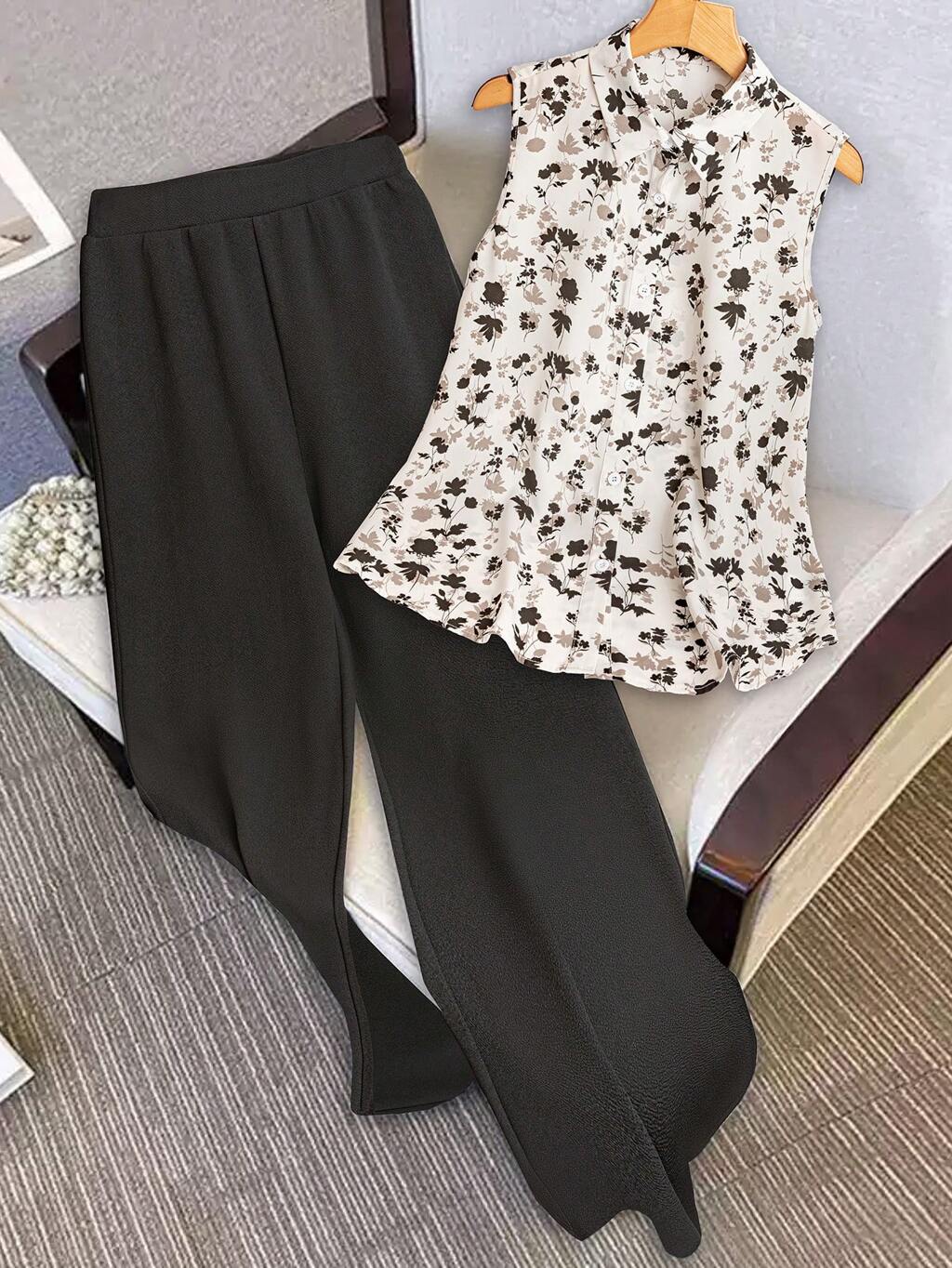 Women's 2pcs Sleeveless Shirt And Solid Color Pants Set, Vacation Outfits Women