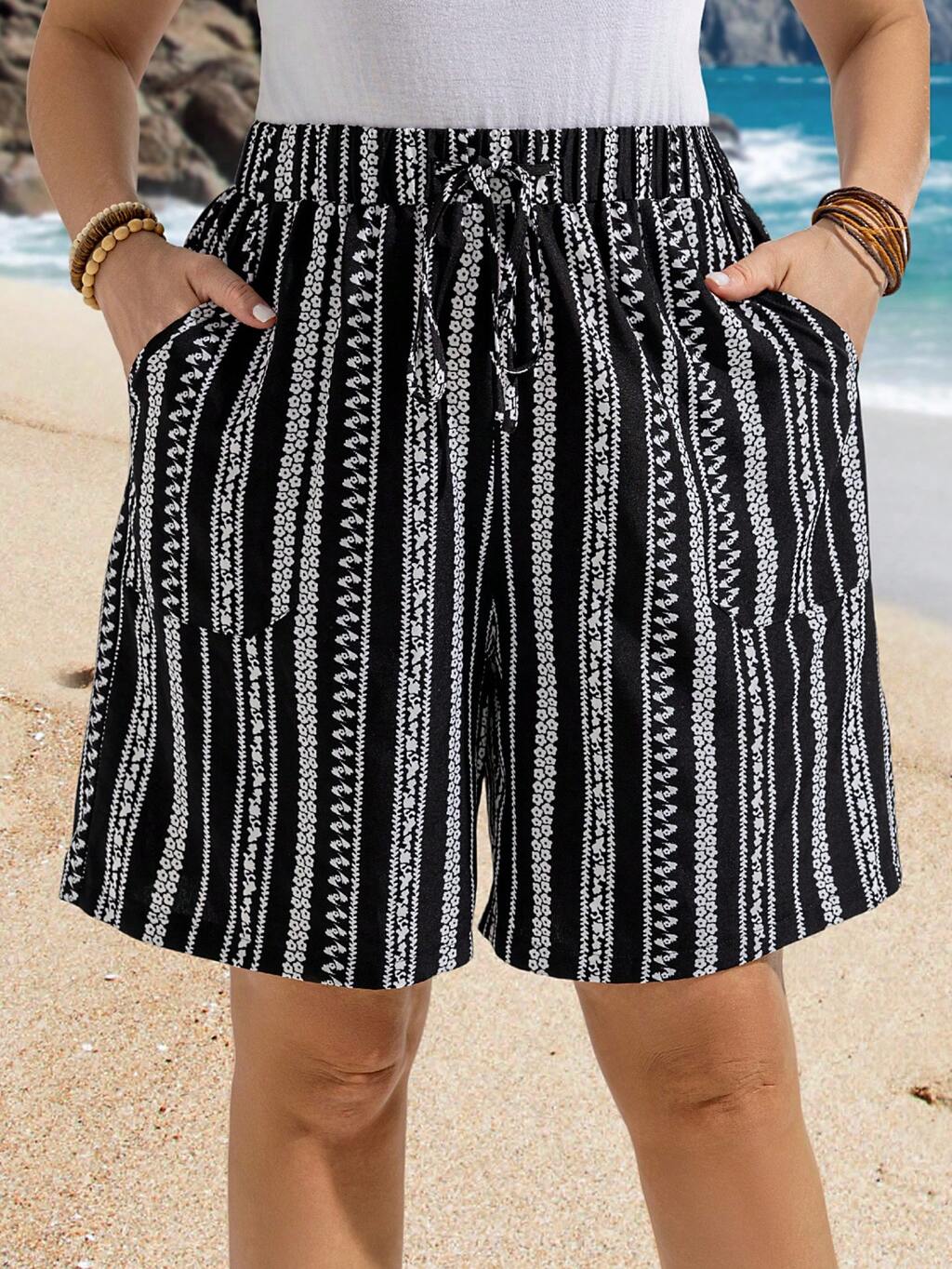 Plus Size All-Over Print Pocket High Waisted Casual Shorts, Summer,Beach Outfits For Woman,Spring/Vacation