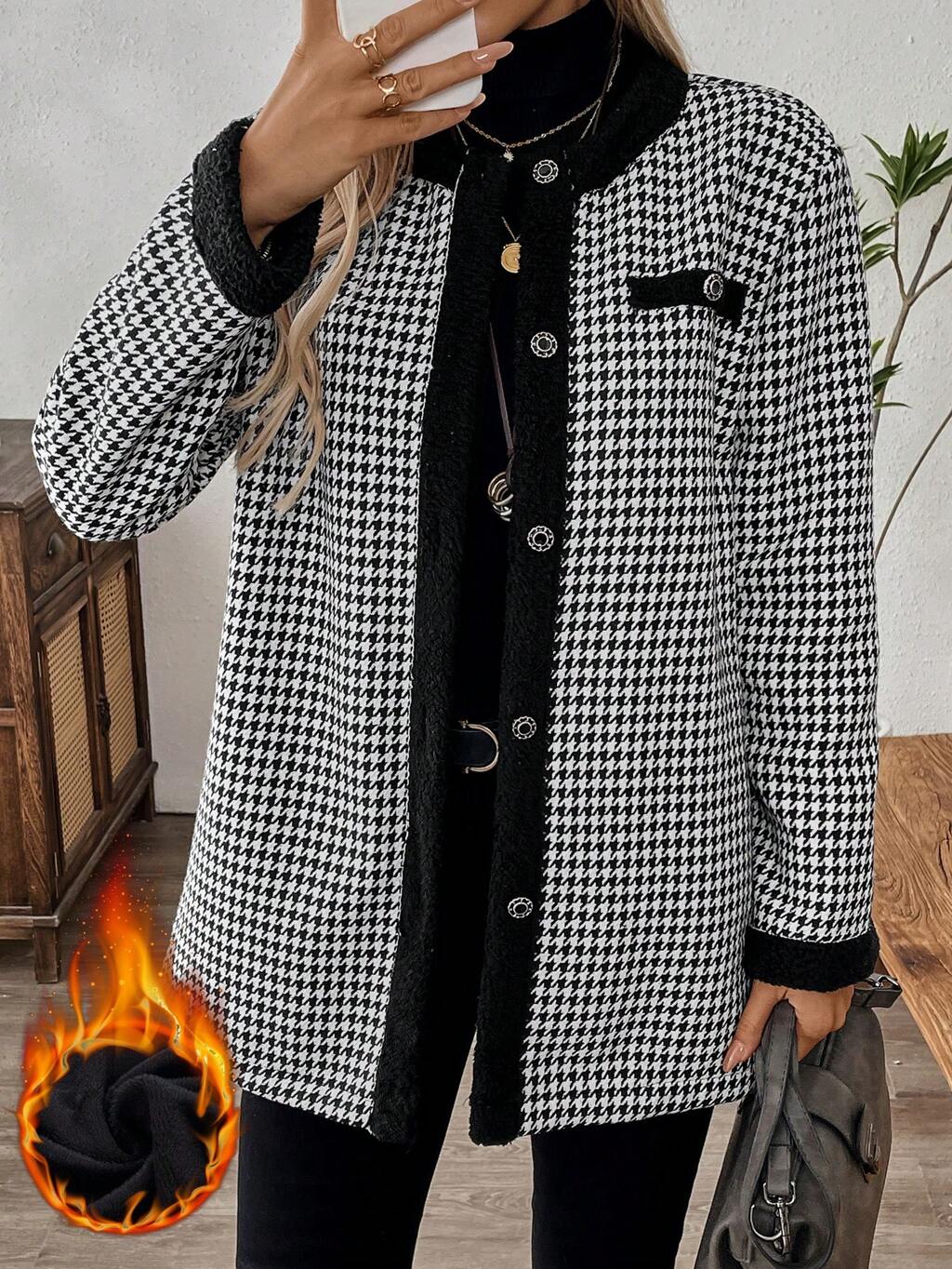 Women's Button Down Color Block Long Sleeve Fashionable Slim Fit Houndstooth Jacket