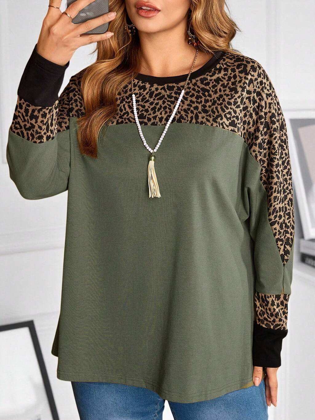 Plus Size Leopard Print Patchwork Batwing Sleeve T-Shirt Winter For Women Cozy Fall And Winter For Women Country Style For Women Country Concert