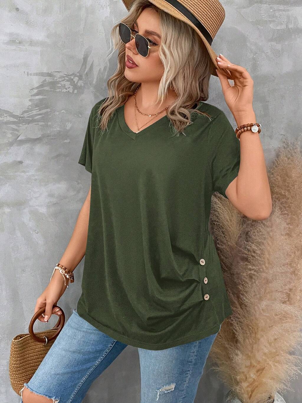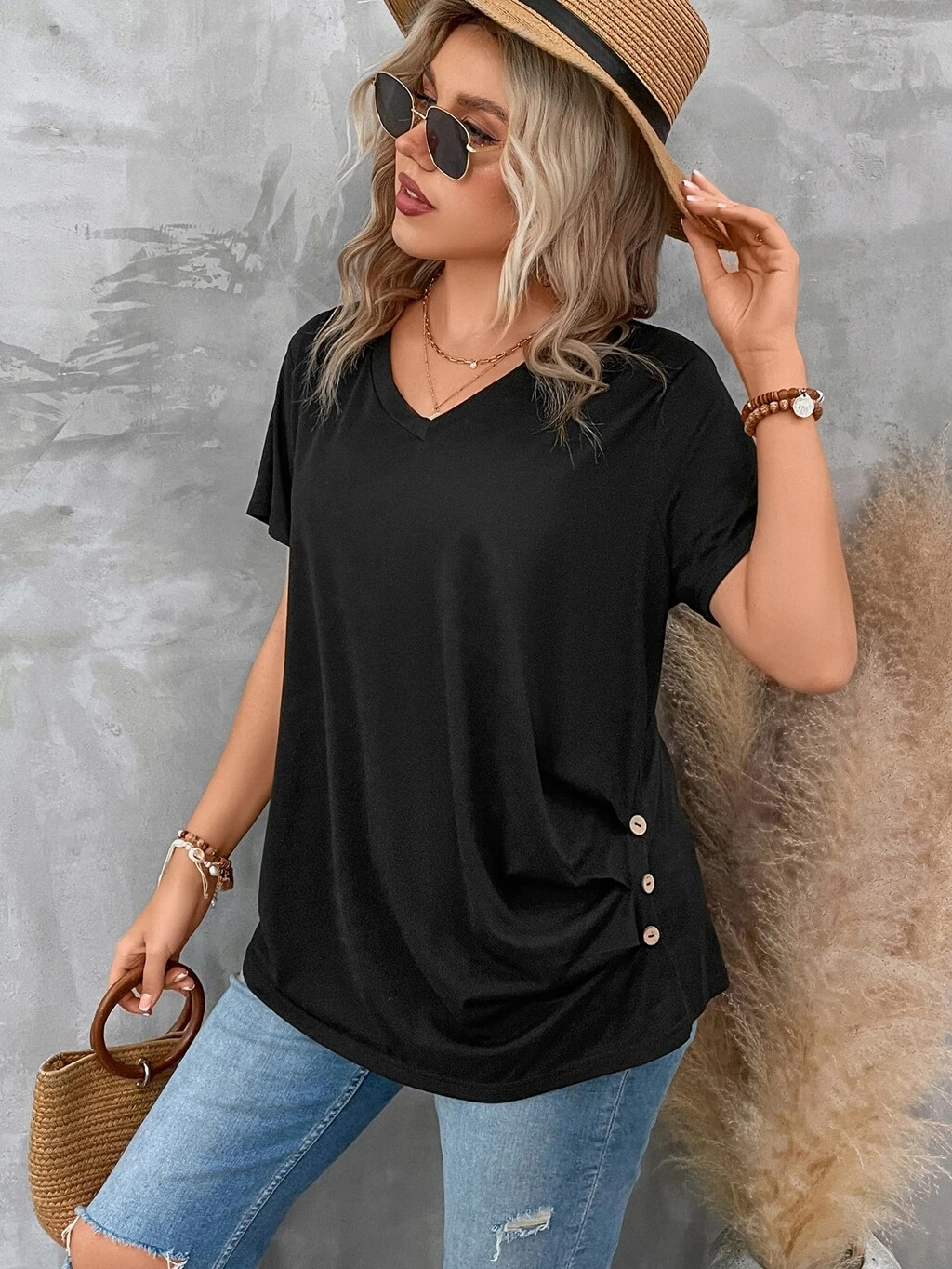 Plus Size Women's V Neck Short Sleeve Pleated T-Shirt Solid Button Detail Tee Button Detail Ruched Tee Tops