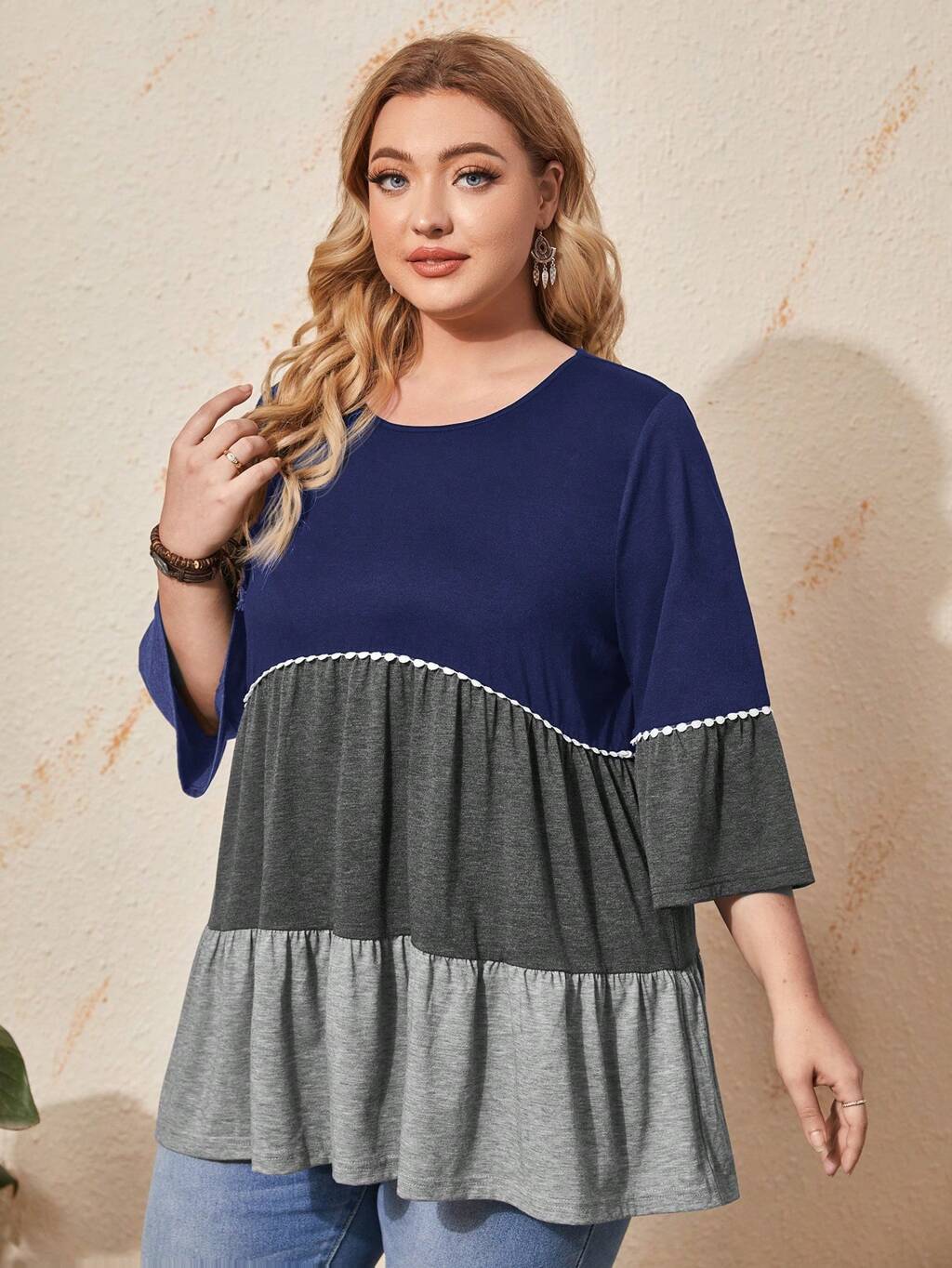 Plus Size Women Summer Contrast Color Round Neck Short Sleeve Loose Ruffle Trim T-Shirt