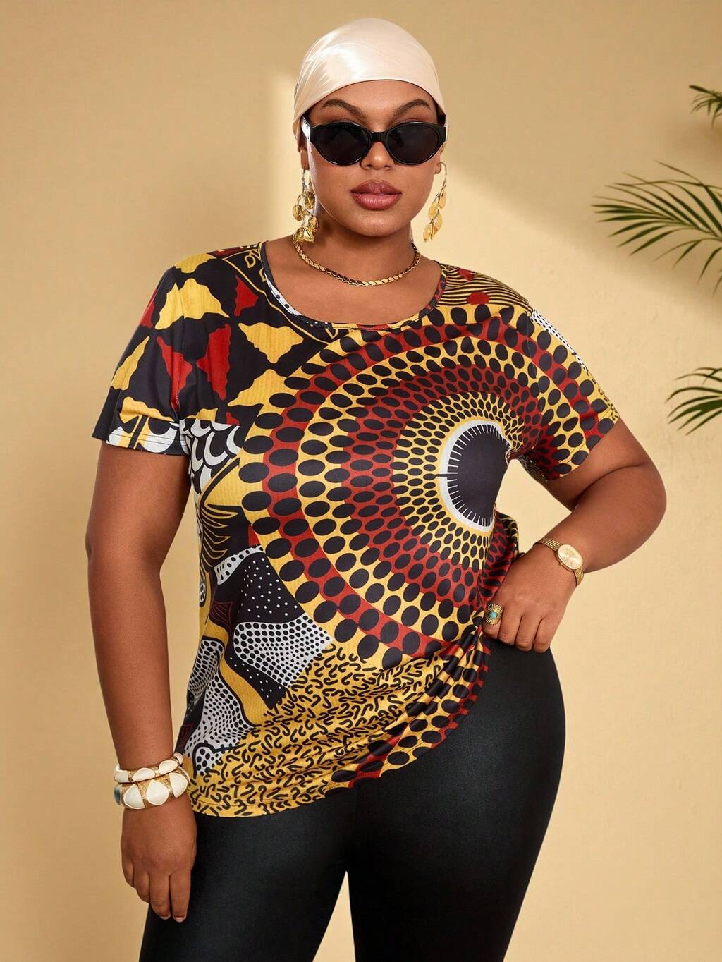 Plus Size Fashionable Printed Round Neck Short Sleeve T-Shirt, Summer\Vacation Plus Size Women Clothes African Clothes Women Plus Size Work Tops Summer Tops Summer Outfits Summer Clothes Spring Dress Spring Outfit Women Spring Clothing Beach Vacation Outfits For Women Vacation Dress Bohemian Festival Outfits For Women Beach Outfits For Women Casual Blouses For Women
