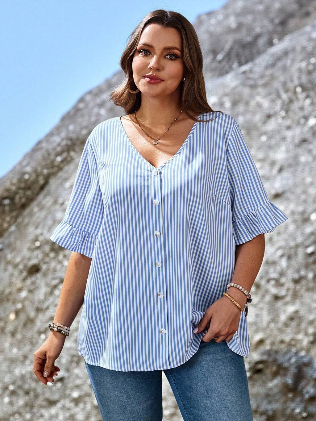 Plus Size Casual Striped Ruffle Trim Shirt\Summer\Vacation, Summer Tops
