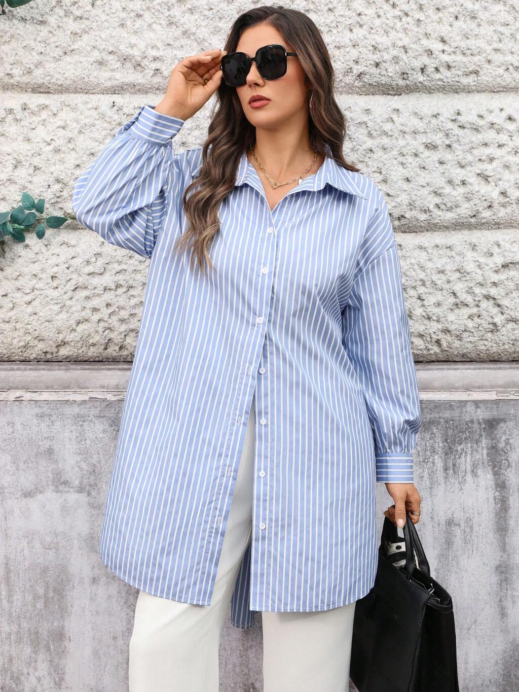 Plus Size Casual Everyday Striped Front Button Down Shirt, Autumn For Summer/ Vacation Long Blouses Blue And White Shirt Blue Striped Shirt Oversize Shirt For Women Summer For Women Beach Holidays Going Out Top Women Oversized Shirt Long Shirts For Women