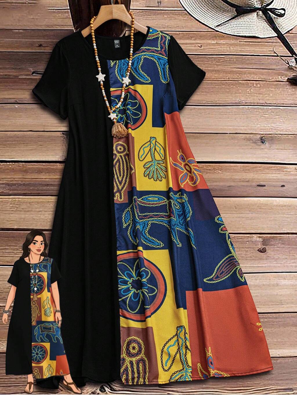 Plus Size Women V-Neck Patchwork Color Casual Party Dress, Suitable For Summer Summer Dress Summer Outfits Summer Clothes Spring Dress Spring Outfit Women Spring Clothing Beach Vacation Outfits For Women Vacation Dress Bohemian Summer Holiday Outfits Jalabiyas