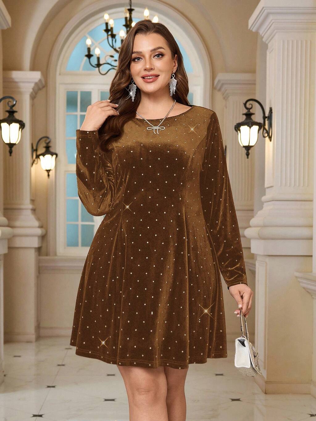 Plus Size Women Black Velvet Rhinestone Decor Round Neck Dress Valentine's Day Brown Plus Size Dress Elegant Dresses For Women Elegant Dresses Elegant Dress For Women Elegant Dress For Women Birthday Dress New Year Dress Brown Dress Sparkly Dress Valentine's Day