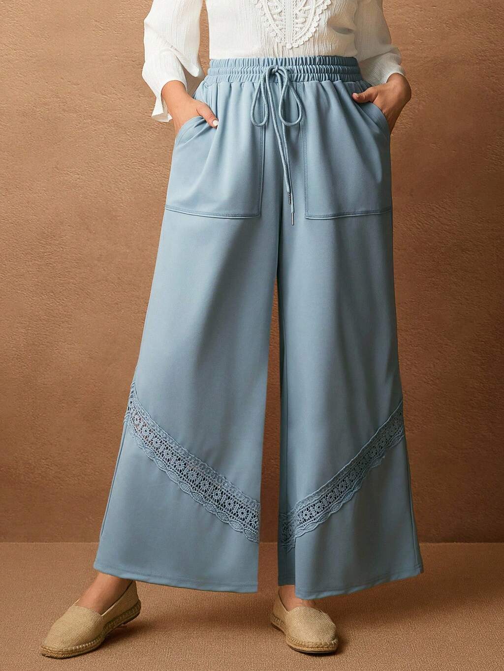 Plus Size Women's Solid Color Drawstring Waist Pockets Contrast Lace Wide Leg Loose Elegant Pants