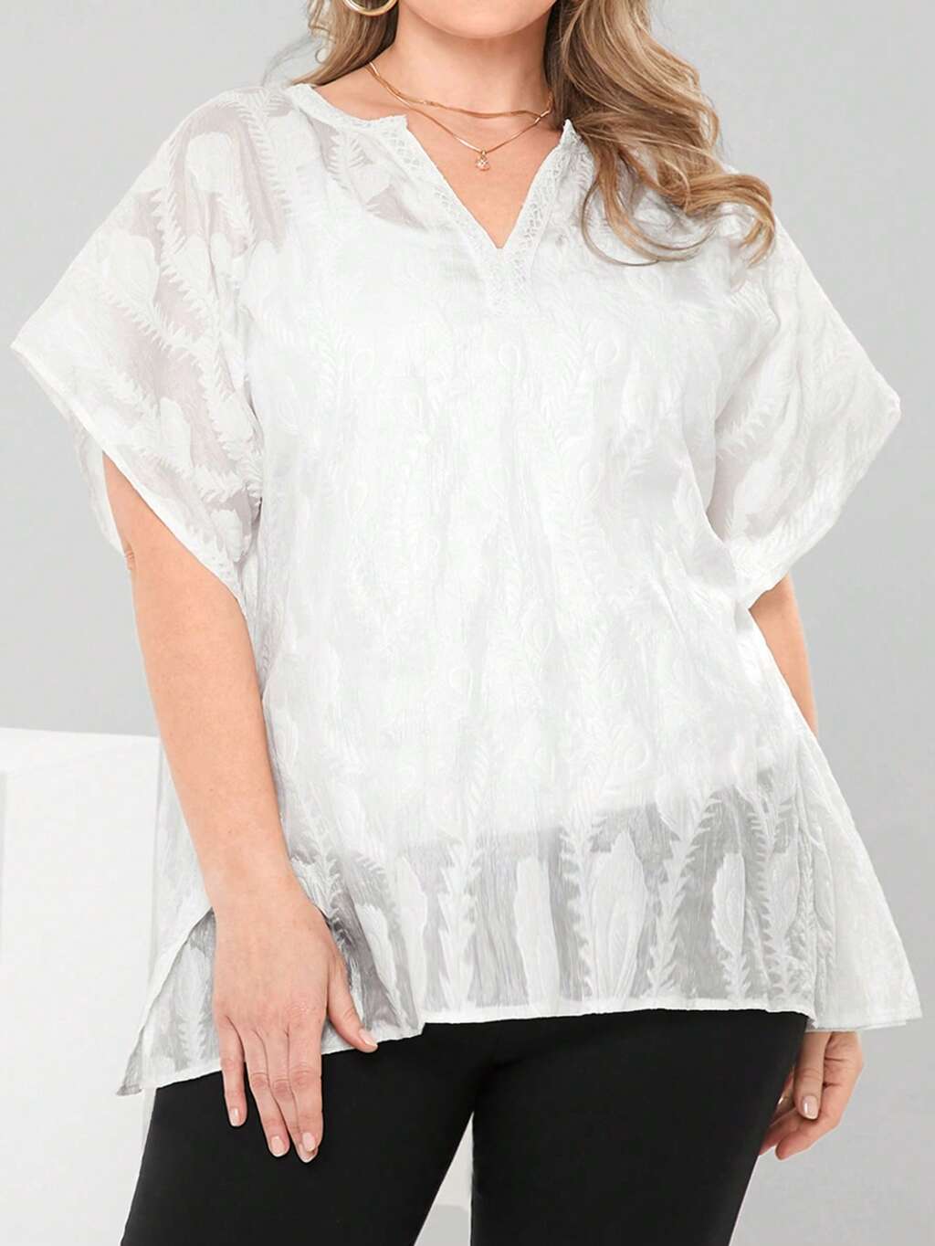 Plus Size Women's White Bat Fit Feather Pattern Sheer Elegant Women's Top Summer Outfits Spring Outfits For Women Beach Outfits For Woman Mature Elegant Woman