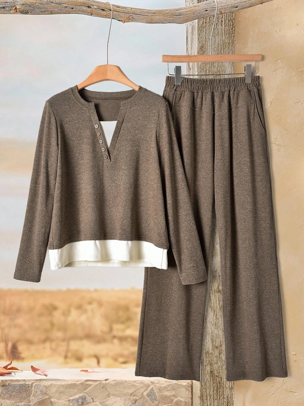 2 Stücke Damen Lässig Patchwork Kontrast Farbe Top & Hose Set Braun Zweiteiler Set Damen Zweiteiler Set Damen Bequem Komfortabel Zweiteiler Set Damen Zweiteiler Loungewear Set Zweiteiler Pyjama Set HERBST