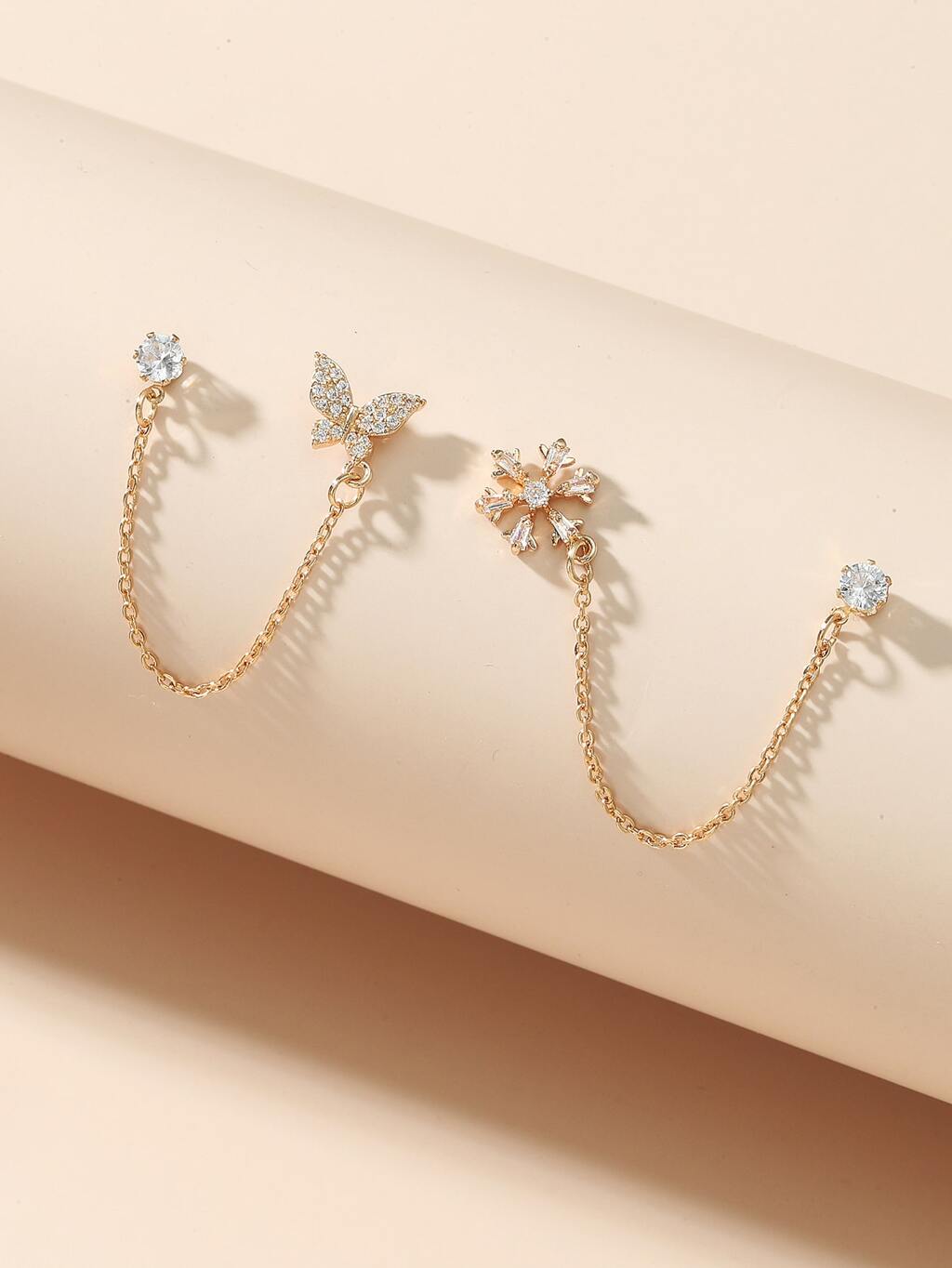 Set Of 2 Asymmetrical Copper Earring With Zirconia Flower And Butterfly Embellishment Valentines,Mom,Mother,Mother's Day,Gift