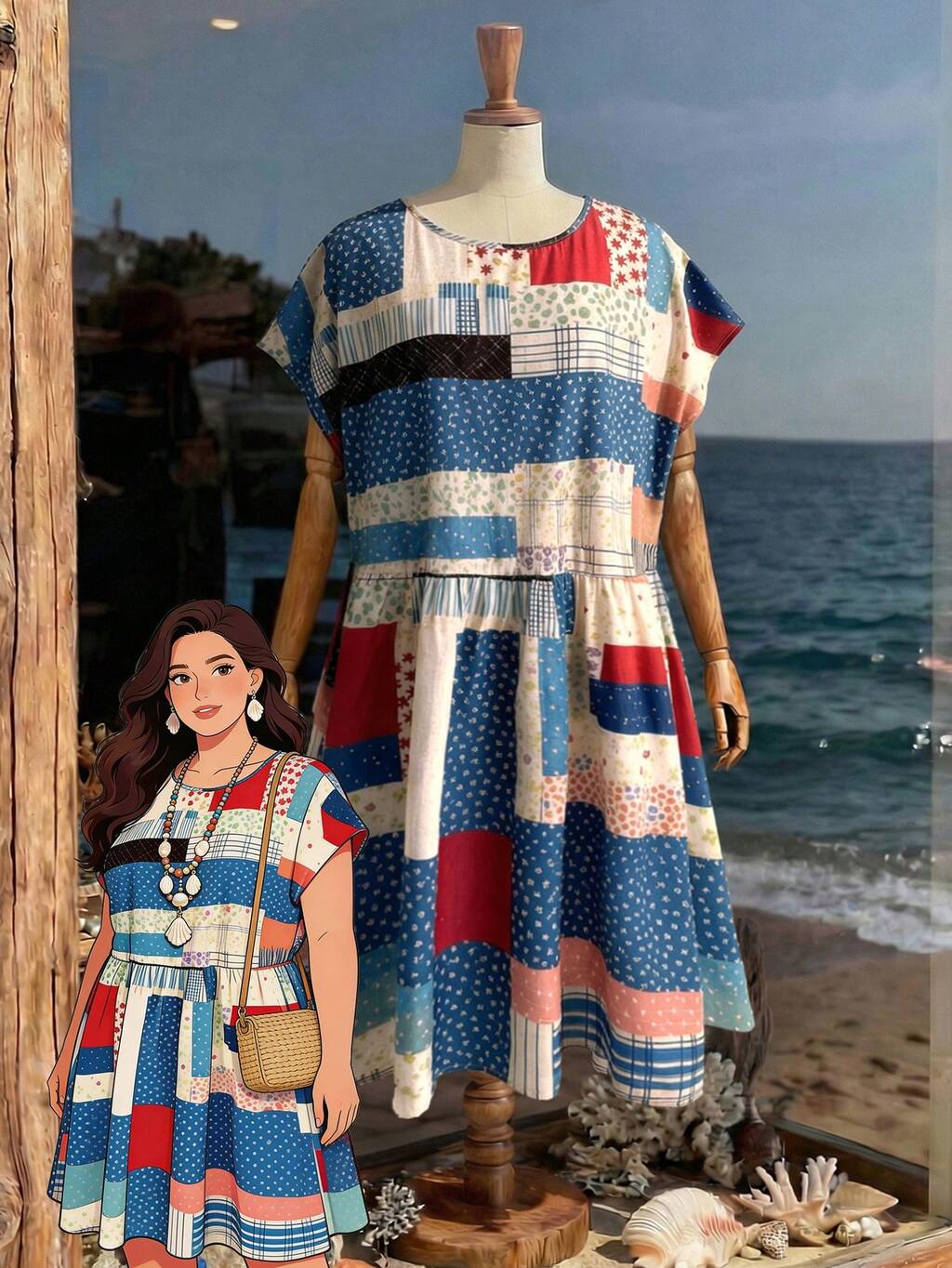 Robe d'été de style vacances à la plage pour femmes grandes tailles, style patchwork imprimé, manches chauve-souris, taille resserrée