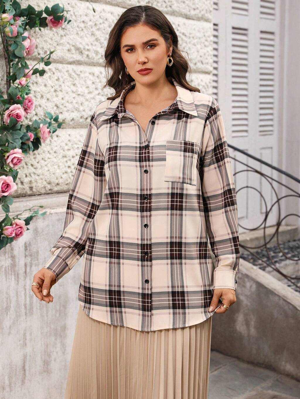 Plus Size Casual Plaid Front Button Long Sleeve Shirt, Autumn For Summer/ Vacation Summer For Women Beach Holidays Going Out Top Plaid Button Up Oversize Shirt For Women