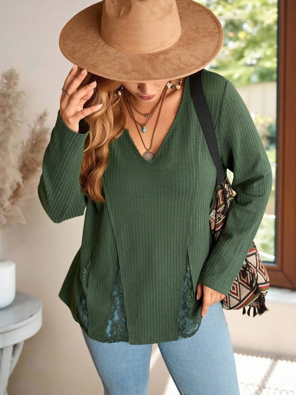 Plus Size Women Contrast Lace V-Neck Long Sleeve Casual Loose T-Shirt Winter For Women Cozy Fall And Winter For Women Casual Blouses For Ladies Country Style For Women Country Style For Women Country Concert