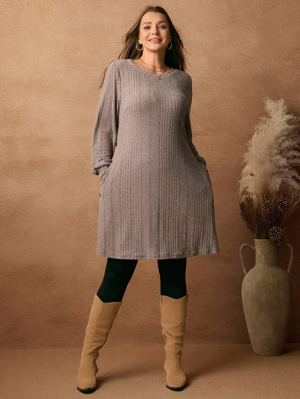 Plus Size Women Solid Color Button Half Placket Long Sleeve Pocket Ribbed Casual Loose Dress,Winter Dresses For Women,Elegant Party Outfit,Casual Outfit For Women