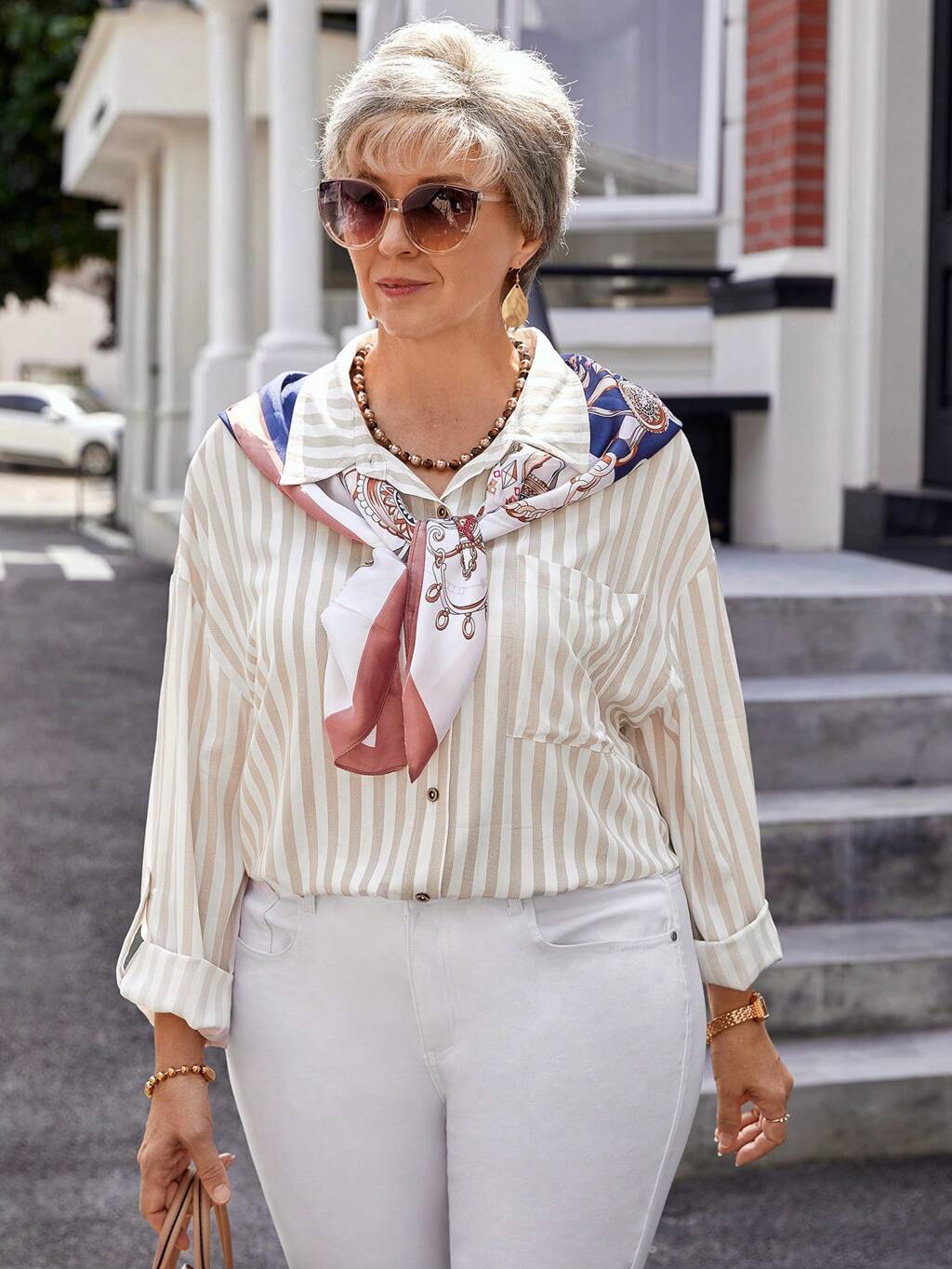 Plus Size Winter Clothes For Women Casual Striped Print Front Button Down Pockets Long Sleeve Shirt,