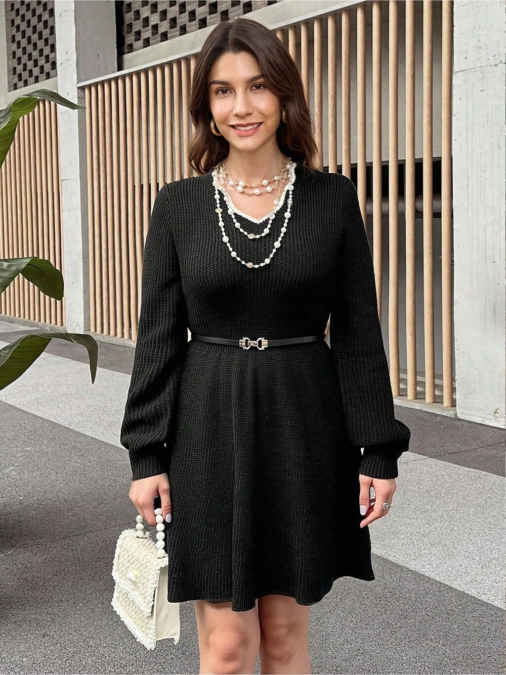 Women's Elegant Solid Color Fitted Knit Dress, Suitable For Commuting An Elegant, Slim-Fitting Black Sweater Dress For Women, Featuring A V-Neck, Long Sleeves, And Button Details. A Stylish Black Sweater Dress For Women, Featuring Center-Front Button Details And A Slim Fit. Perfect For Fall And Winter, This Dress Can Be Worn As An Inner Or Outer Layer, Perfect For Any Occasion.