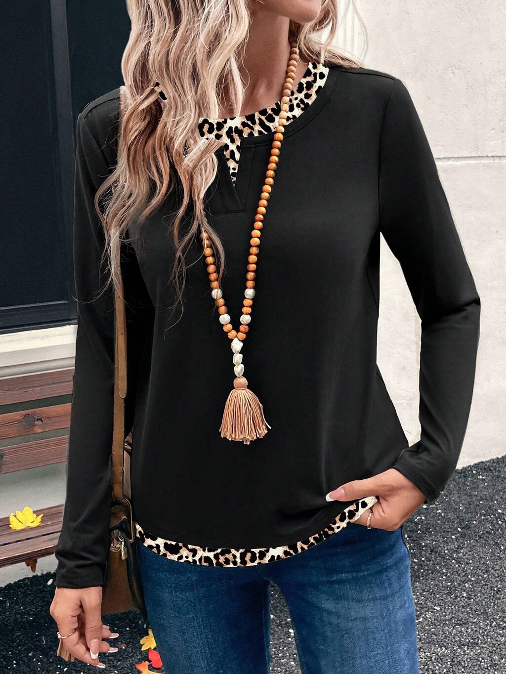 Women's Long Sleeve Top,Black Leopard Print Mosaic Color Contrast T-Shirts