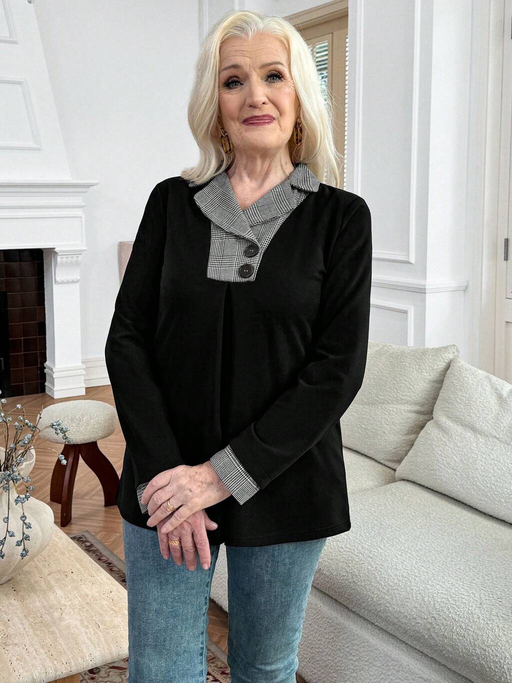 1pc Women's Casual Plaid Patchwork Keyhole Neck 2 In 1 T-Shirt, Autumn Season