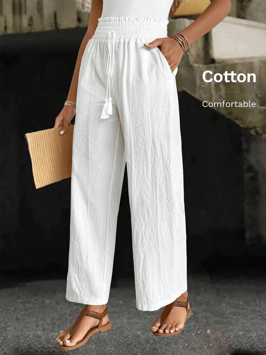 Women's Solid Color Self-Tie Waist Wide Leg Loose Casual Pants Cotton