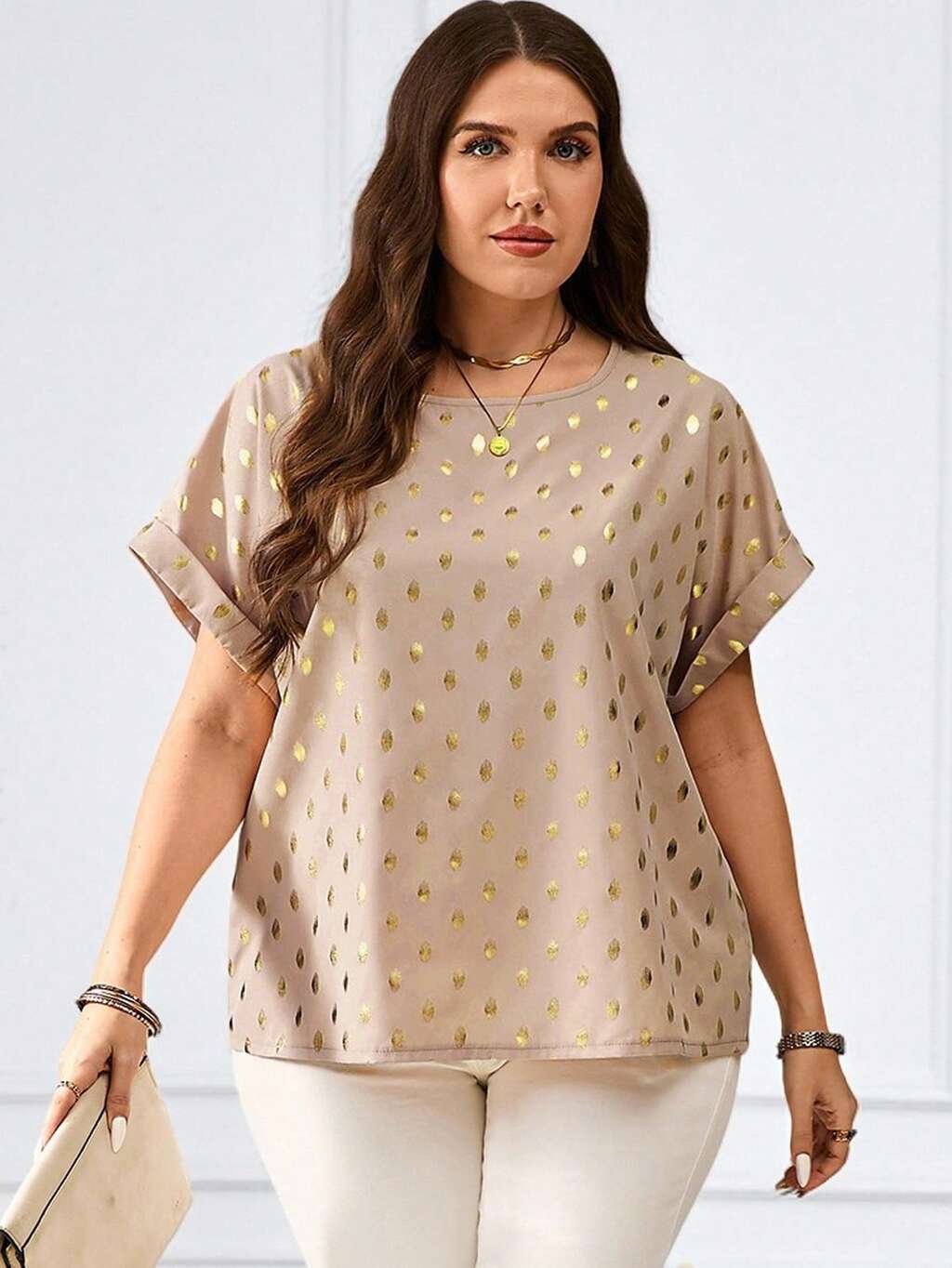 Blusa con maniche a pipistrello e stampa a pois in oro laminato, taglia comoda, adatta per l'estate, le vacanze e la primavera