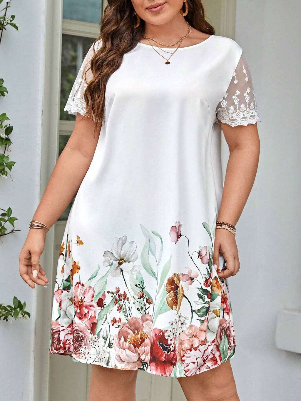 Plus Floral Print Embroidery Mesh Tunic Dress, Summer,Beach Dress Sundress,Holiday Outfits Boho