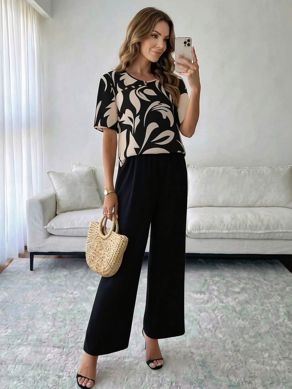 This Elegant Two-Piece Set For Women, Perfect For Spring And Summer, Features A Classic Black And White Color Scheme That Is Simple Yet Sophisticated, Perfectly Matching The Refined Atmosphere Of The New Year. The Abstract Floral Pattern Adds A Touch Of Modern Design To Its Minimalist Style. The Outfit Consists Of A Short-Sleeved, Loose-Fitting Top And Black Wide-Leg Trousers, Offering Comfort, A Slimming Effect, And A Polished Look. Suitable For Spring And Autumn, This Set Can Be Accessorized With Jewelry To Brighten Up The Look Or Layered With A Jacket For Added Depth. Perfect For Both Work Commutes And Casual Gatherings, This Set Showcases A Sharp And Stylish Look At Work Or Adds A Touch Of Elegance To Small Gatherings With Its Contrasting Colors And Pattern. It's A Versatile Piece That Combines Practicality And Style For Your New Year's Wardrobe.