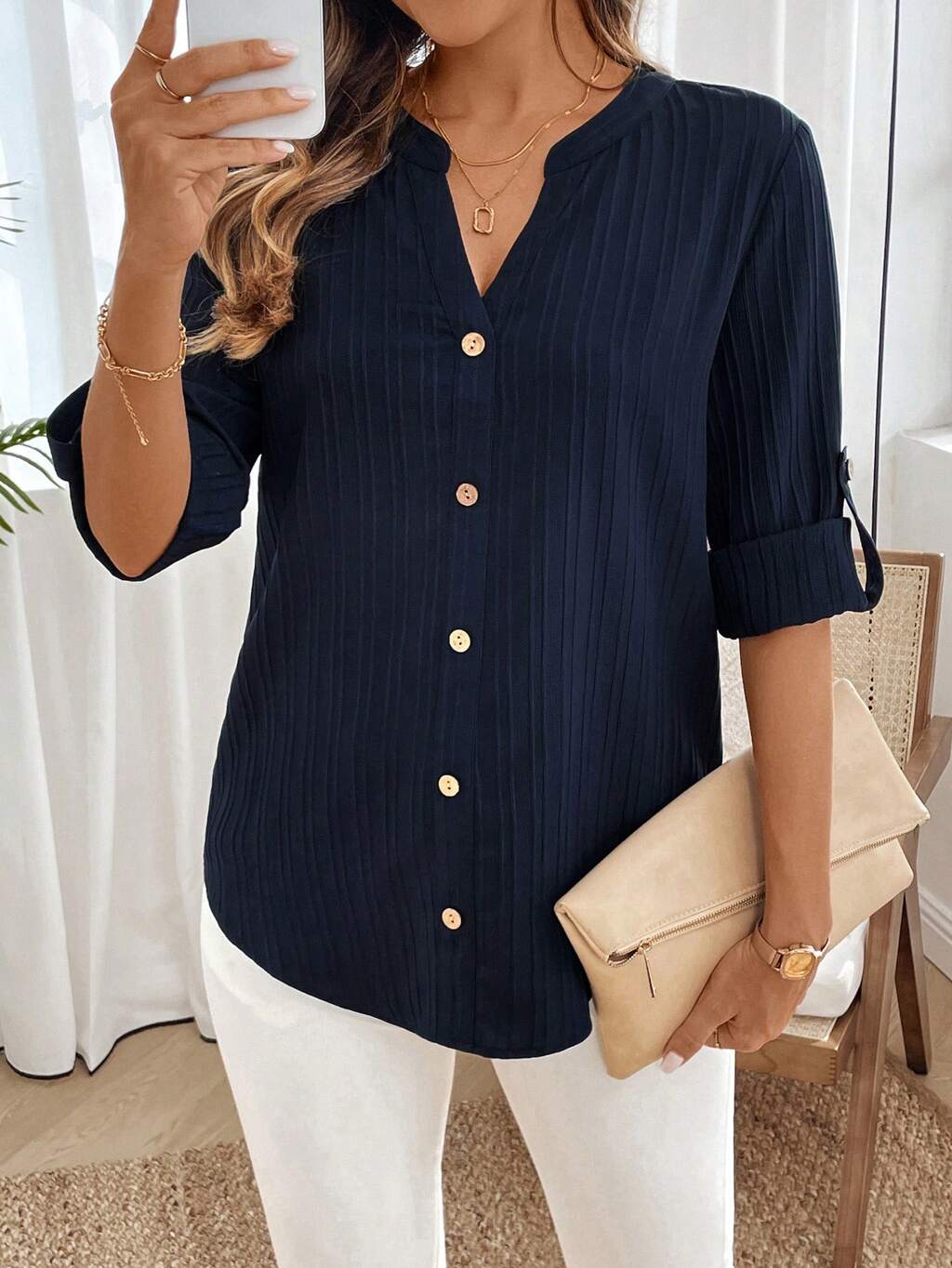 Plus Size Solid Color Notched Neck Roll Up Sleeve Casual Blouse ,,Spring/Summer/Vacation