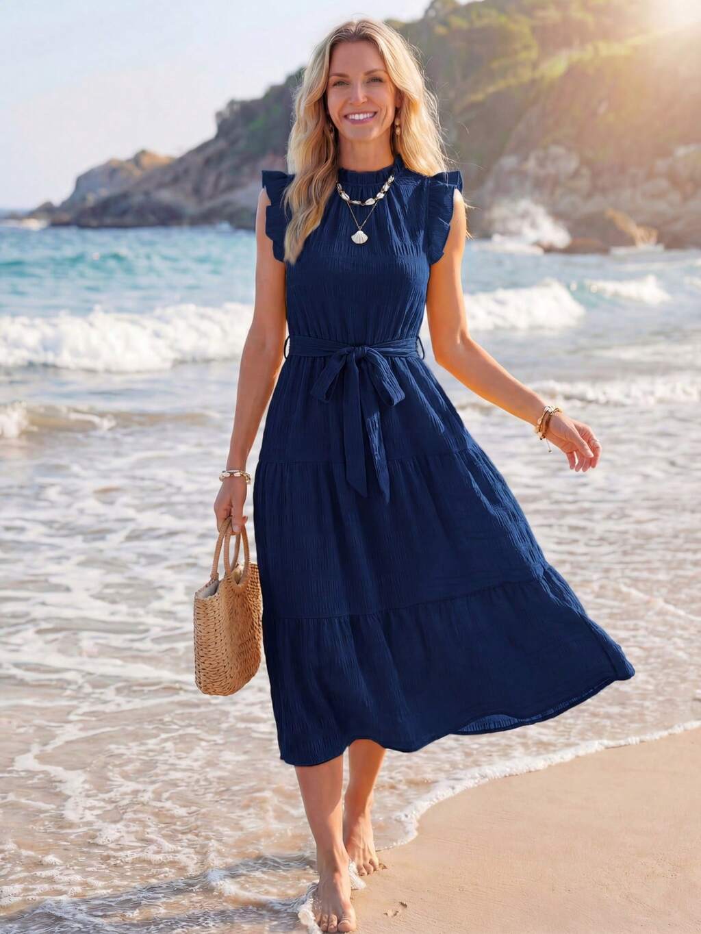 Frill Trim Belted Ruffle Hem Dress,Vacation