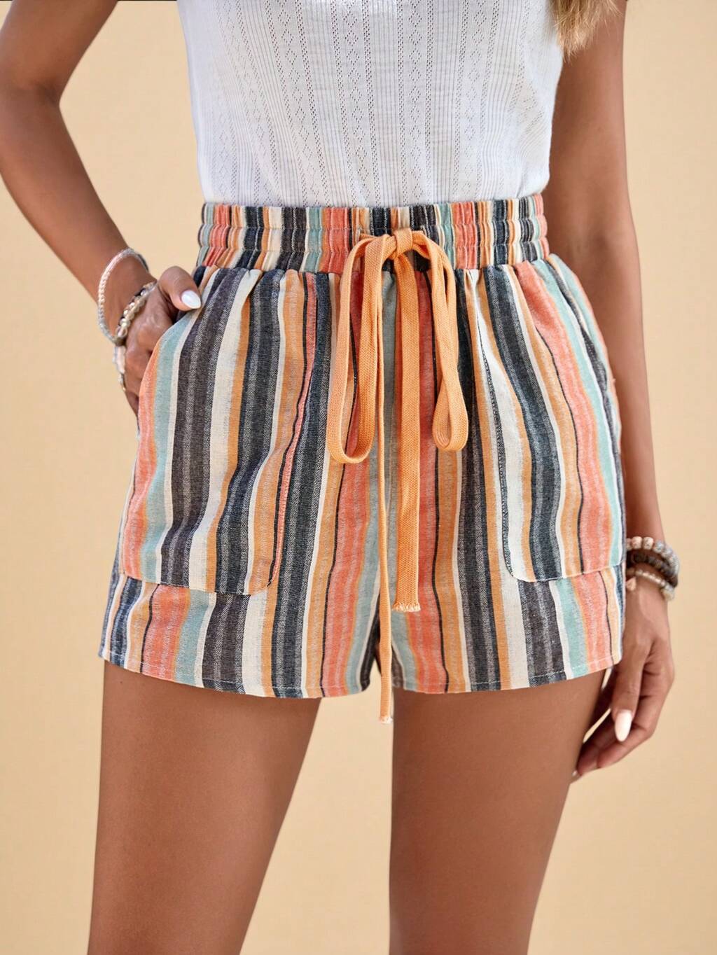 Summer Beach Striped Drawstring Waist Slant Pocket Shorts