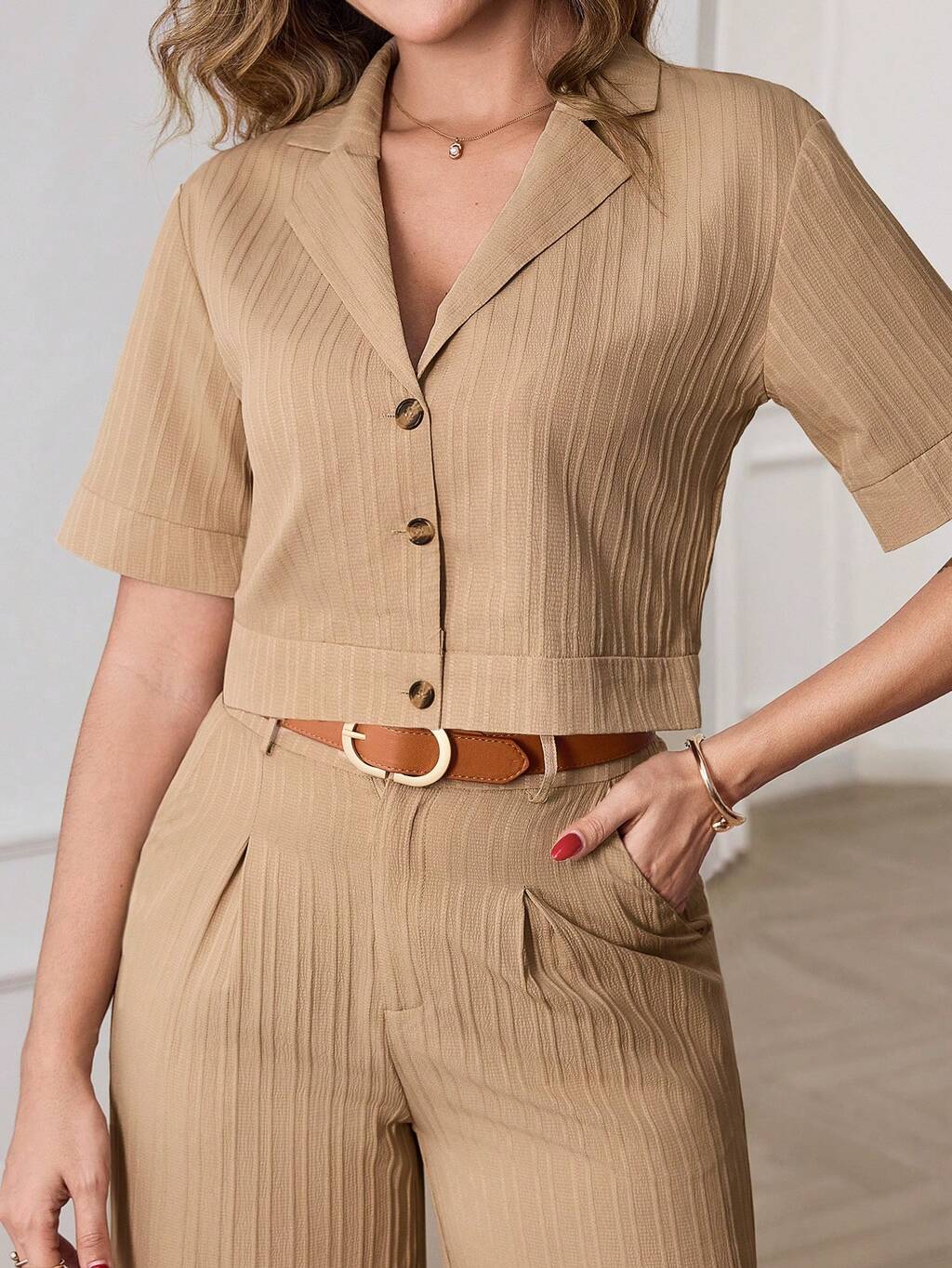 Elegant Beige Belted Blazer Two-Piece Set For Women Summer Spring Formal Outfit With Short Sleeve Peplum Blazer And Wide Leg Pants, Ideal For Wedding Guest Graduation Formal Office And Going Out Occasions
