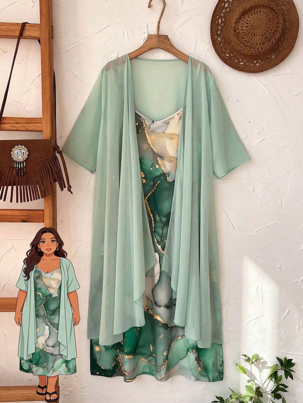 Plus Size Women 2pcs Set: Solid Color Short Sleeve Robe & Marble Print Cami Dress, Casual For Summer/ Vacation Summer Outfits Summer Clothes Spring Spring Outfit Women Spring Clothes Country Style For Women Summer Kimono Boho Kimono Mint Green Dress Women Kimono For Woman