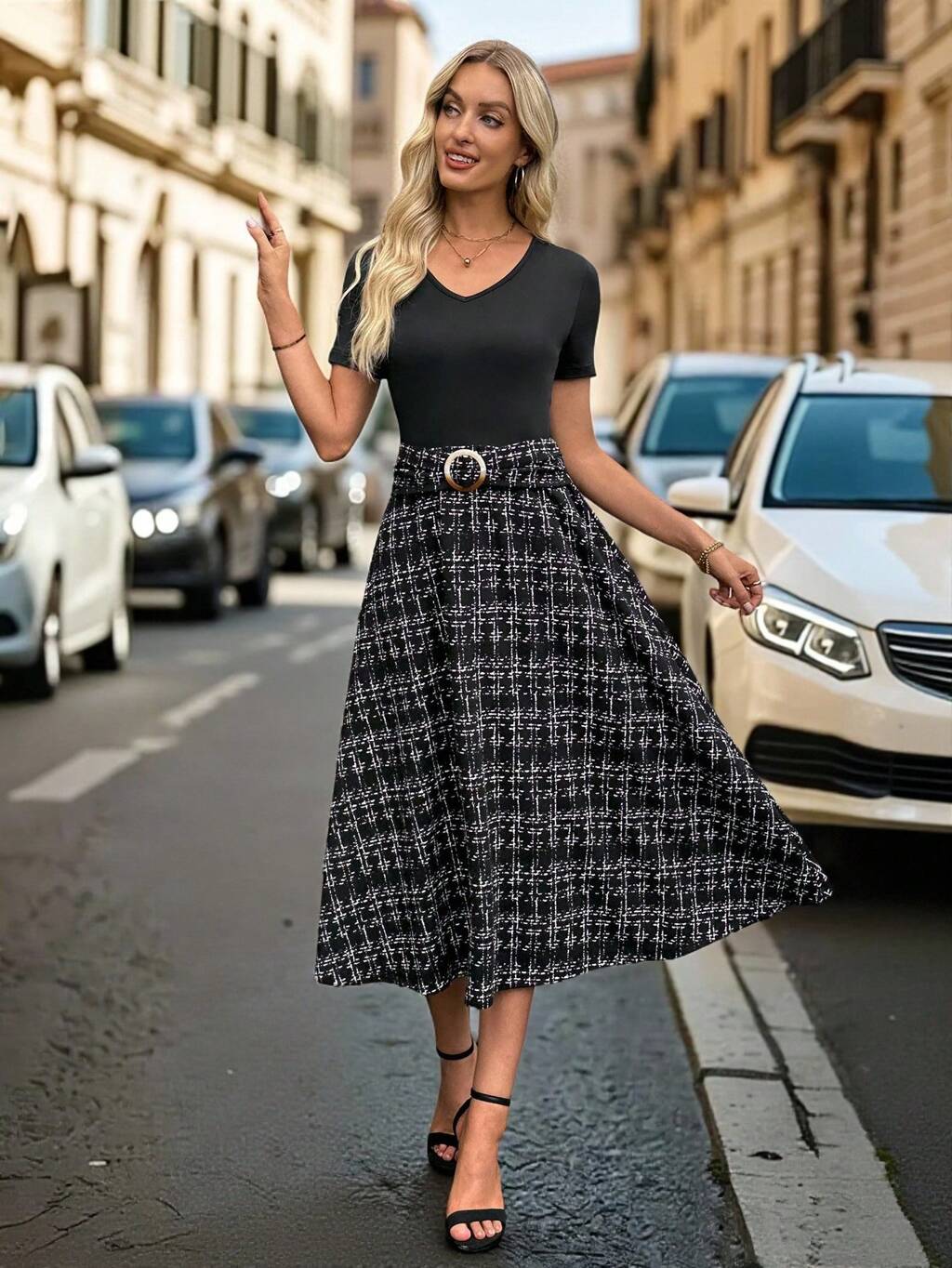 Women's Casual Plaid Patchwork V-Neck Short Sleeve Mid-Calf Dress, Summer Checkered Skirt Plaid Skirt Women Midi Skirt Belt Skirt Black And White Skirt Fall Women Clothes Fall Clothes Fall Dresses For Women Fall Outfits Women Autumn Clothes Fall Outfits Autumn Winter Clothes For Women Winter Business Casual Back To School