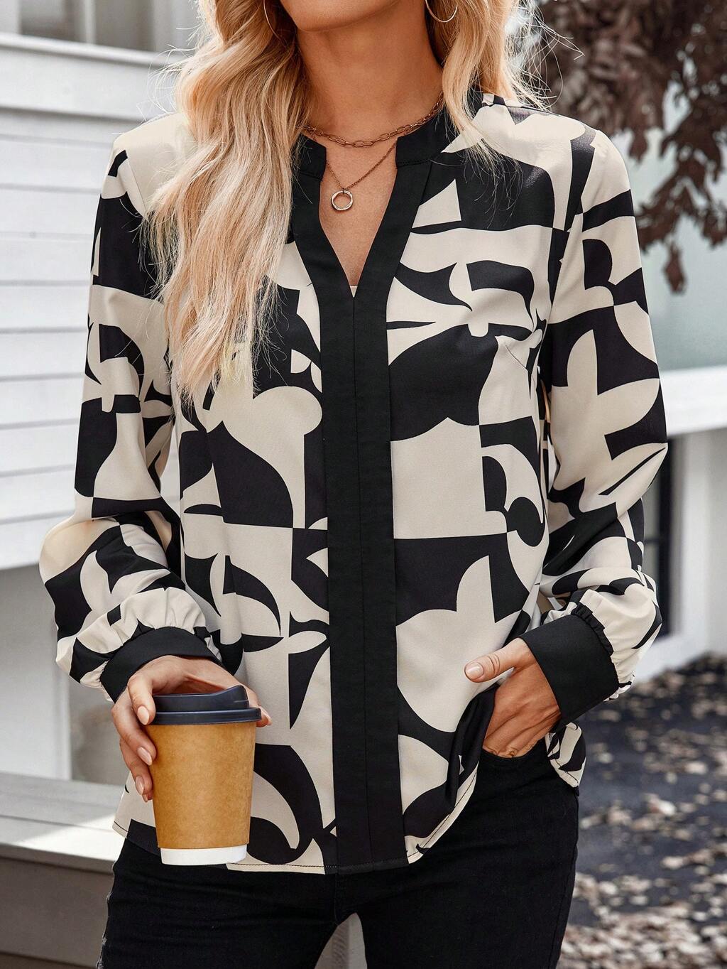 Women's V-Neck Long Sleeve Allover Print Minimalist Shirt, Casual For Daily Wear