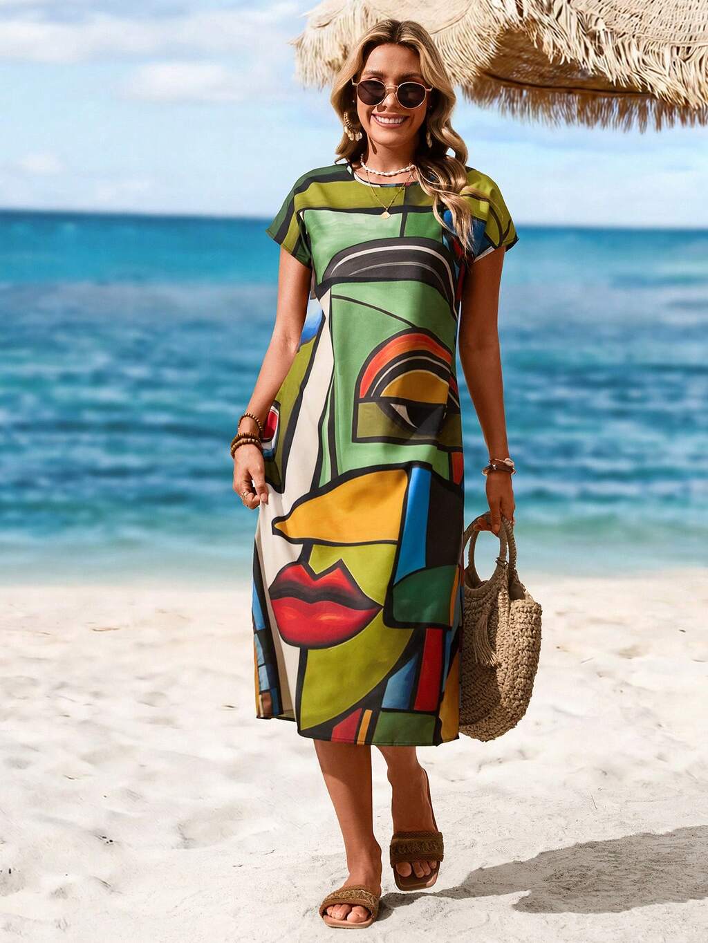 Summer Women Abstract Face Print Round Neck Batwing Sleeve Casual T-Shirt Dress,Vacation