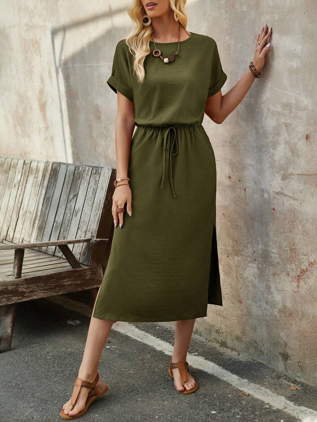 Women's Round-Neck Short-Sleeve Military Green Mid-Length Dress For The Summer