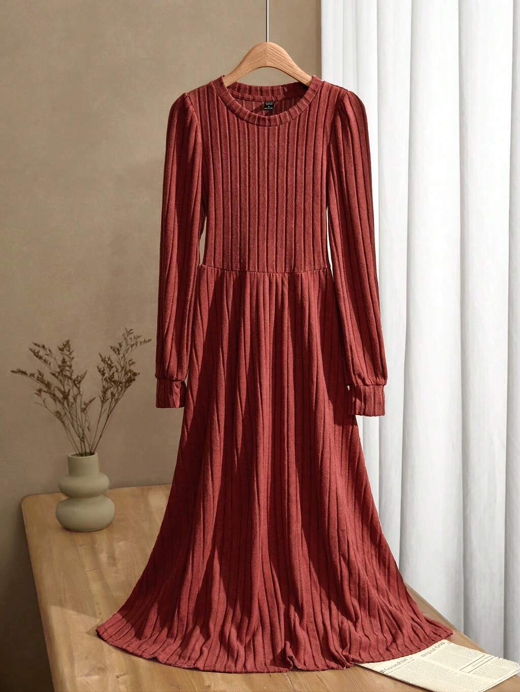 Women's Round Red Dress Neck Lantern Sleeve Ribbed Bodycon Winter Dress