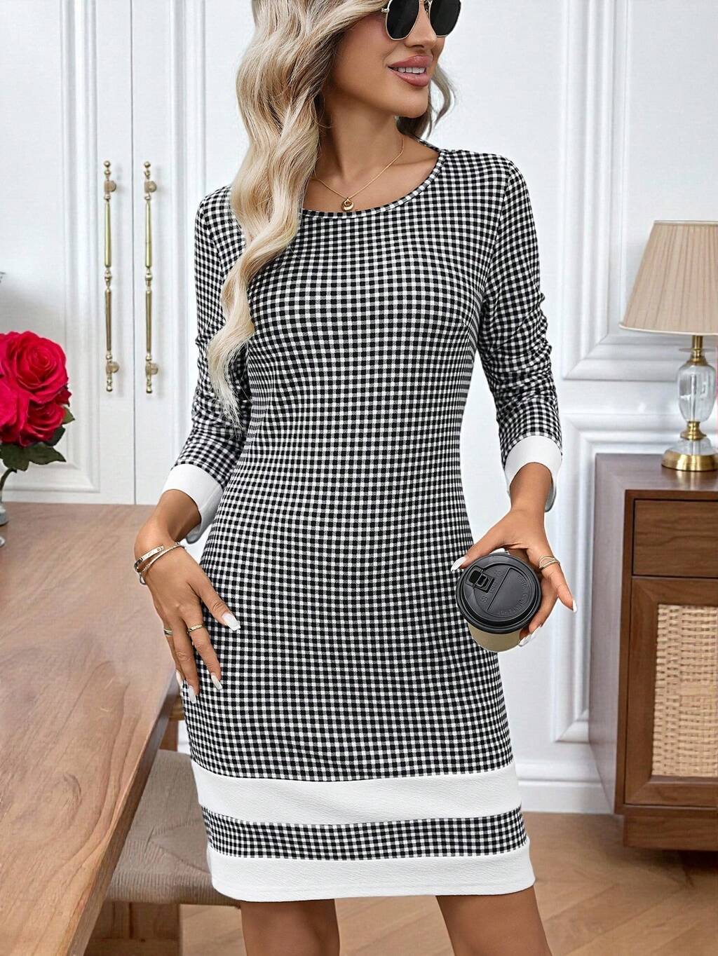 Women's Contrast Plaid Casual Everyday Long Sleeve Mini Dress Checkered Dress Women Long Sleeve Dress Plaid Dress Women Quick Ship Women Dress Black And White Dress